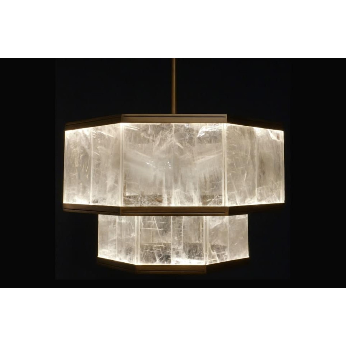 The Kimi stunning chandelier is crafted from rock crystal, showcasing an exquisite blend of natural beauty and contemporary design. The fixture features a geometric structure composed of two hexagonal tiers, each meticulously framed in a sleek, brushed bronze finish. The hexagonal frames house panels of translucent rock crystal, which are distinguished by their natural veining and unique patterns, giving each piece a one-of-a-kind appearance.