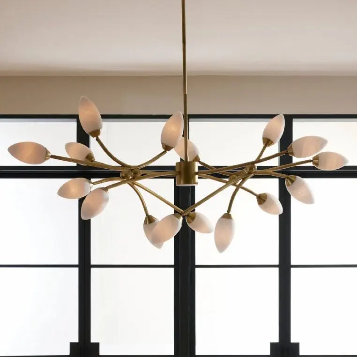 Inspired by the natural elegance of a botanical stem, the EMBER chandelier unfolds with sculptural branches adorned with blooming forms and delicate buds. Crafted in antique brass–plated steel, its organic silhouette balances artistry with function. Each matte swirl glass bulb is thoughtfully oriented to cast light at varying angles, creating depth and movement throughout the space. Subtle variations in finish enhance its artisanal character.