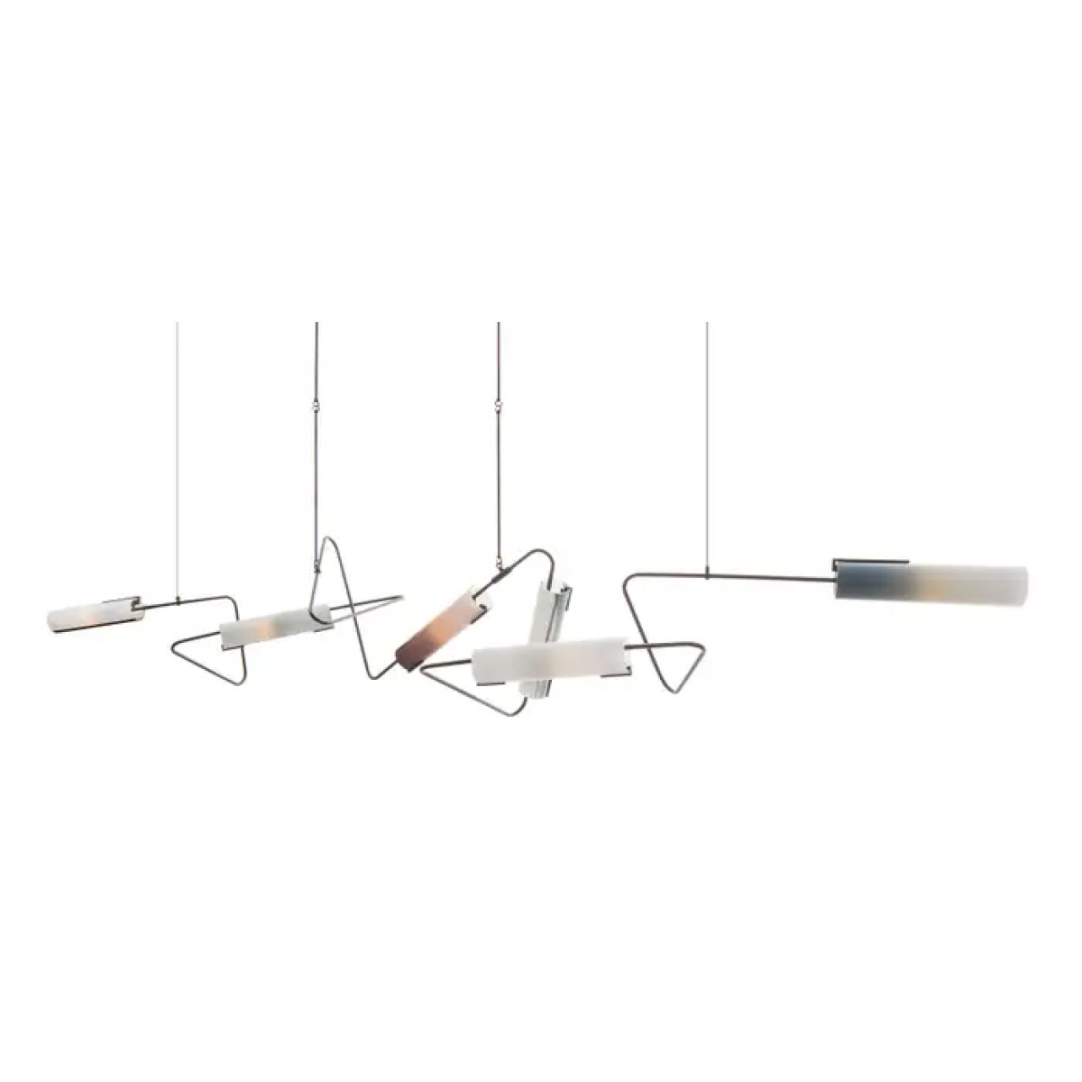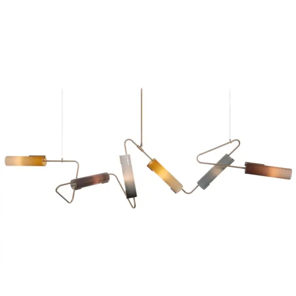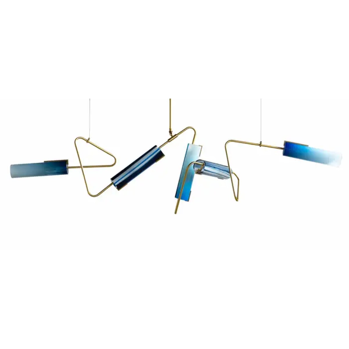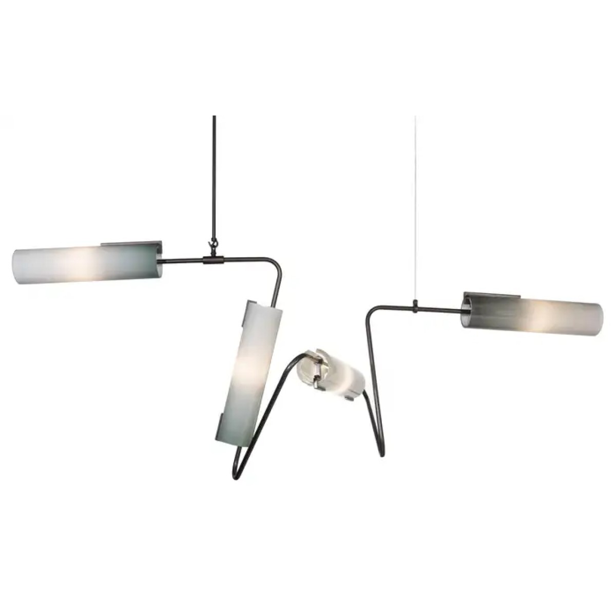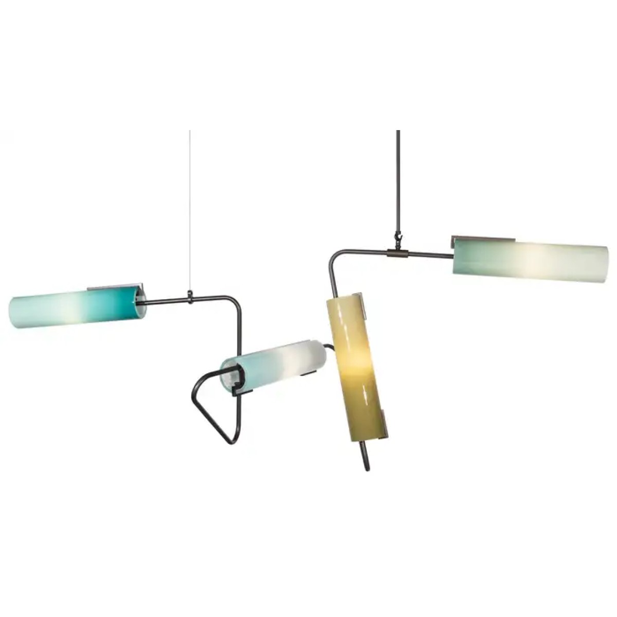 The Continuum Collection was inspired by New York’s vibrant street art. The structure utilizes custom bent tubes that can be connected and arranged in a variety of ways to produce a multiple styles and sizes. The hand blown glass shades are proportioned to accentuate the sculptural lines of the each model. Shades can be sequenced with contrasting glass colors and patterns or used as single tones for a paired down look.