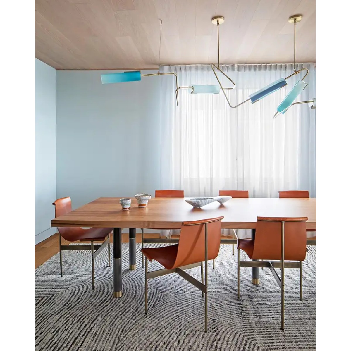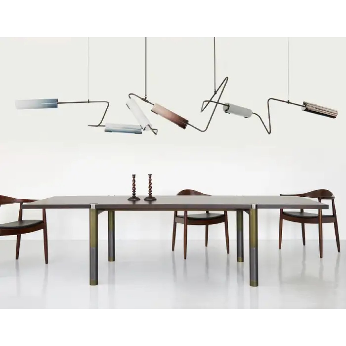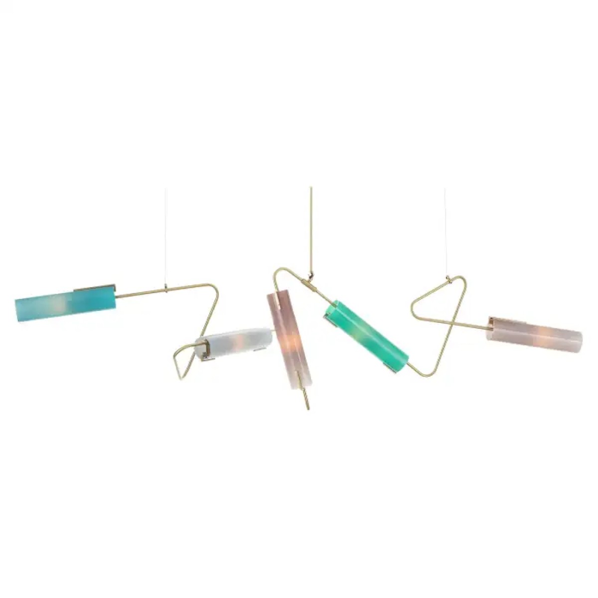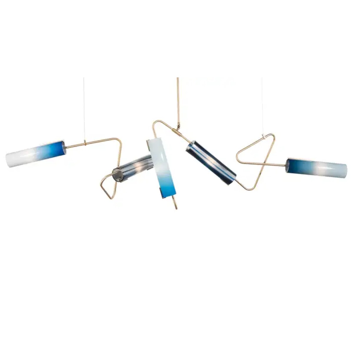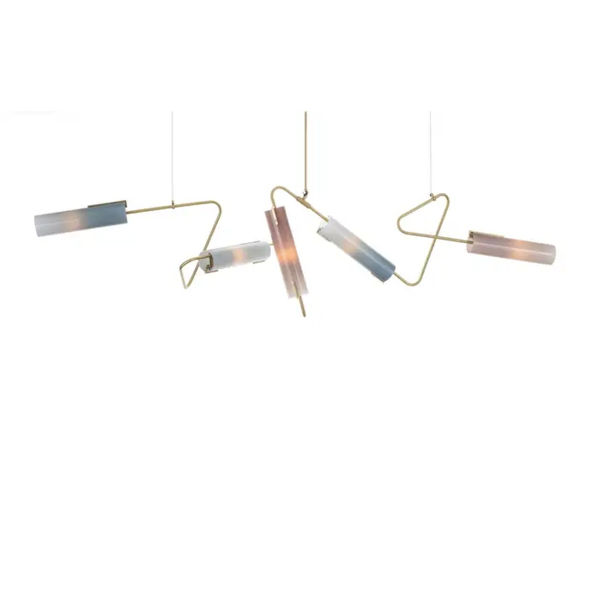 The Continuum Collection was inspired by New York’s vibrant street art. The structure utilizes custom bent tubes that can be connected and arranged in a variety of ways to produce a multiple styles and sizes. The hand blown glass shades are proportioned to accentuate the sculptural lines of the each model. Shades can be sequenced with contrasting glass colors and patterns or used as single tones for a paired down look.