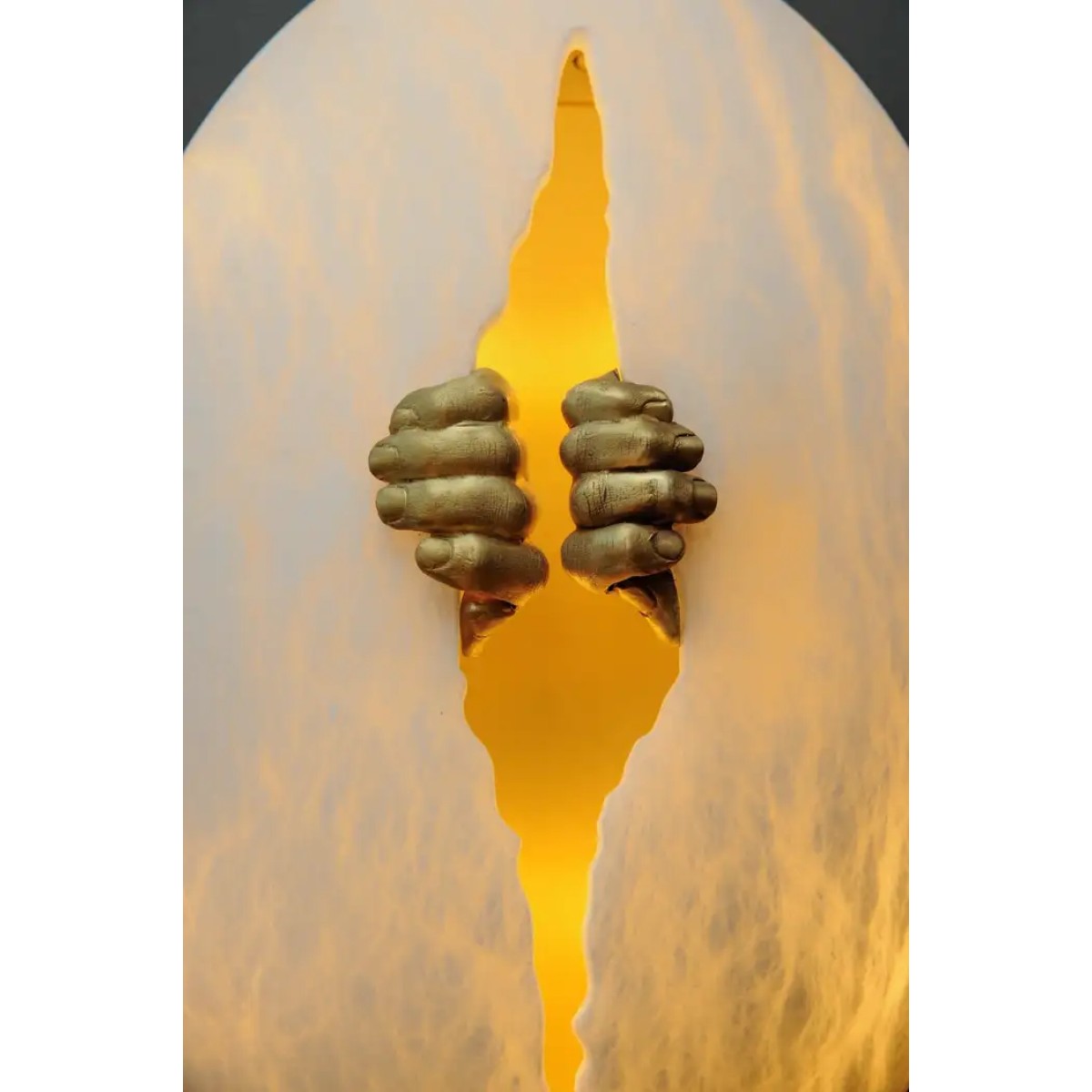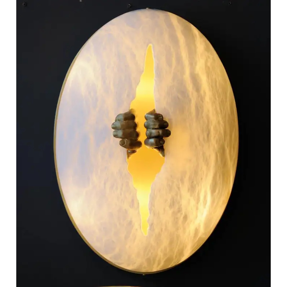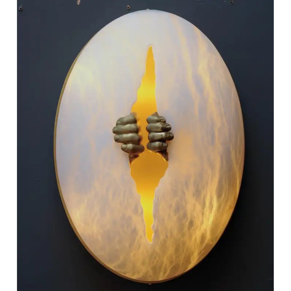 New exclusive design by Glustin Luminaires, egg shaped alabaster sconce with a crack carved in the middle spread by a pair of brass hands. Satin brass plate on the back.