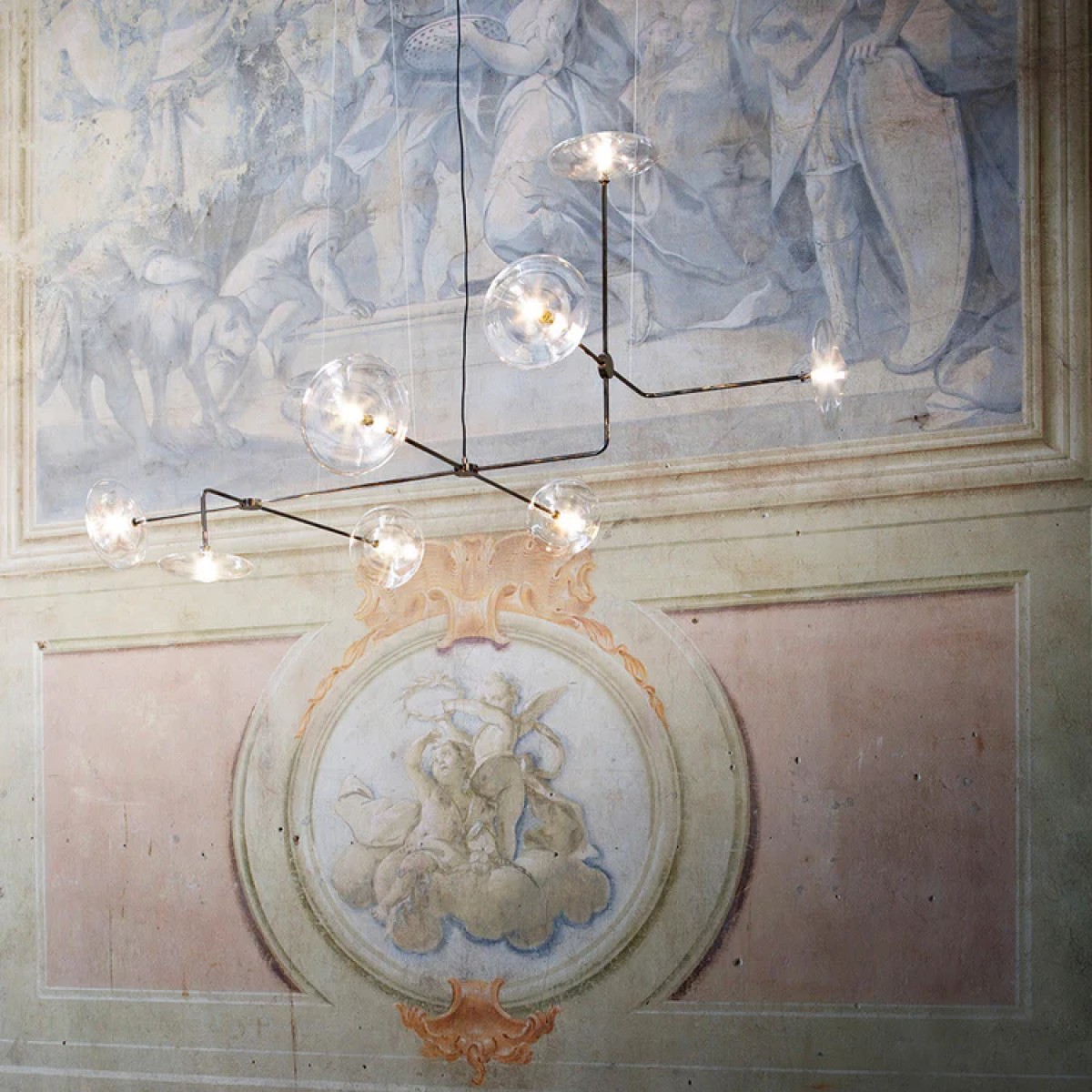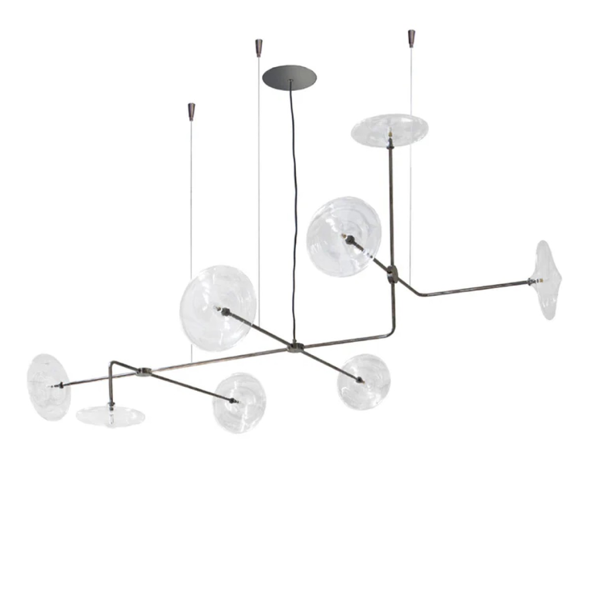 In this exquisite chandelier, industrial influences merge with the effortless charm of unobstructed lighting effects. Its clean frame in polished, chromed black metal comprises eight arms, each supporting a spinning top-like diffuser in borosilicate glass and hosting a G4 lightbulb (not included). Apt for any modern or eclectic setting, the design features diffusers in different diameters (Ø16cm and Ø21cm).