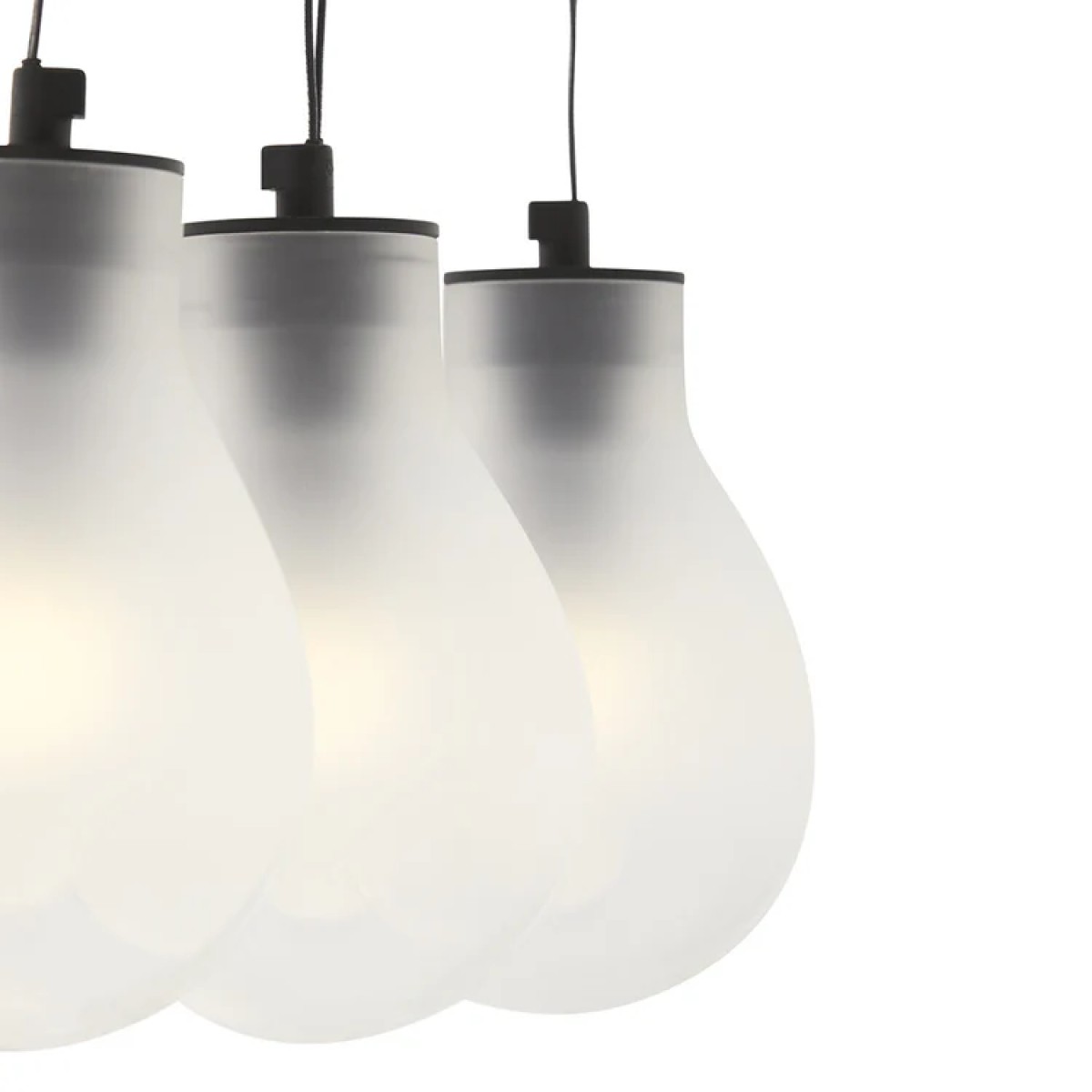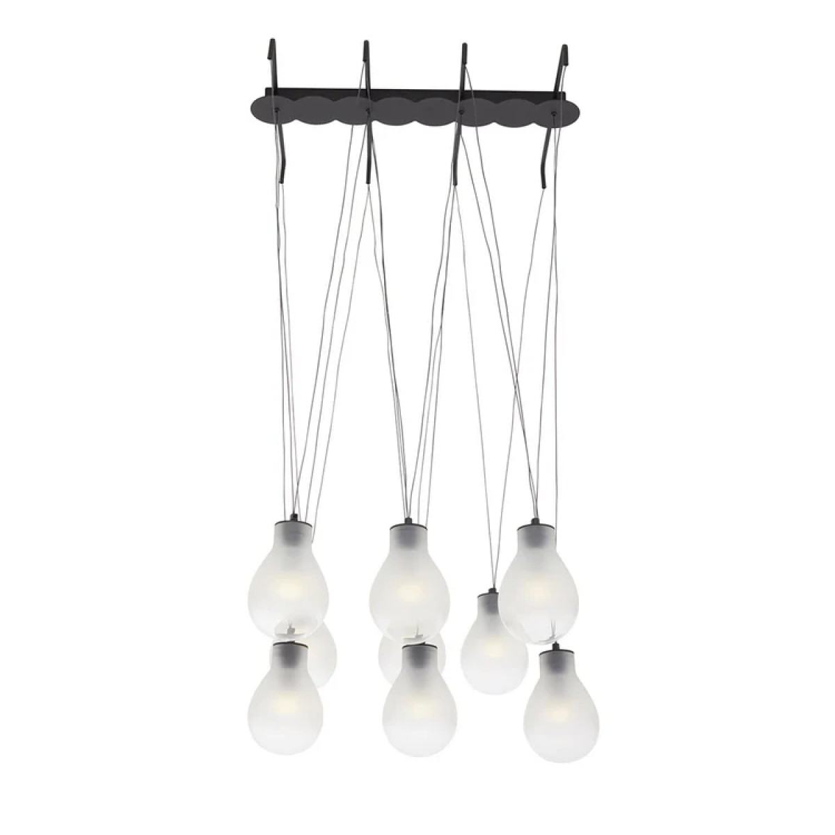 Part of a gorgeous series of lighting fixtures inspired by the ethereal yet unmistakable charm of raindrops, this pendant lamp is composed of nine large lightbulbs suspended on a striking ensemble of V-shaped threads. Hanging from a matte black metal ceiling bar, each bulb is fashioned of polished and mirrored glass enhanced with a warm smokey tone.
