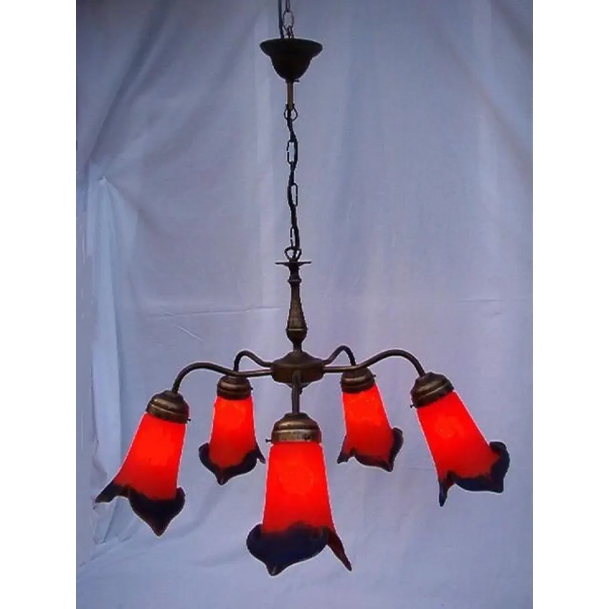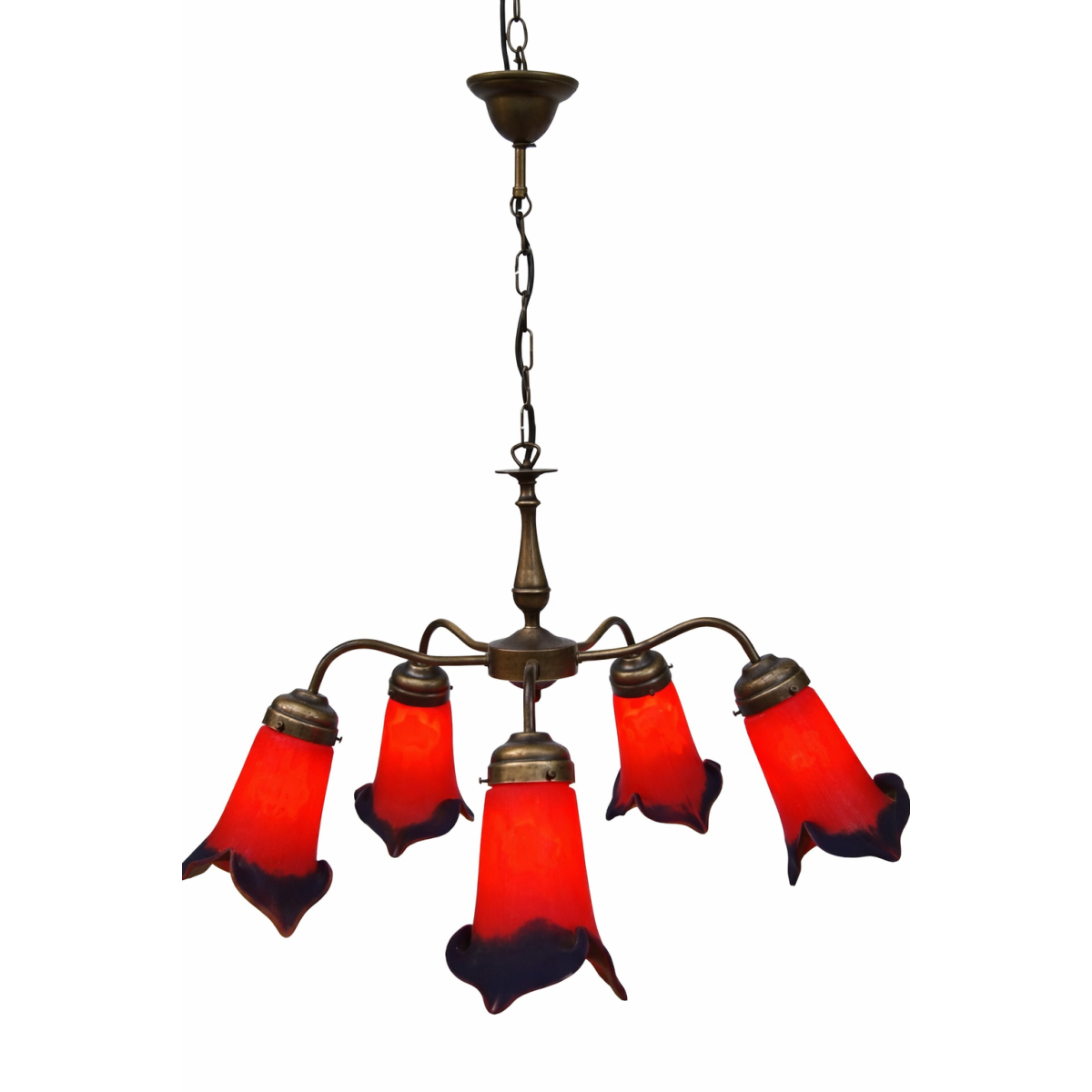The BK 5 Tulipes Chandelier in Antique Gold features five gracefully curved arms, each adorned with exquisite French glass tulip shades. The vibrant red glass with darker flared edges creates a warm, romantic glow that beautifully complements the rich antique gold finish. Blending vintage charm with classic French elegance, this chandelier makes a striking statement in dining rooms, living spaces, or boutique interiors.