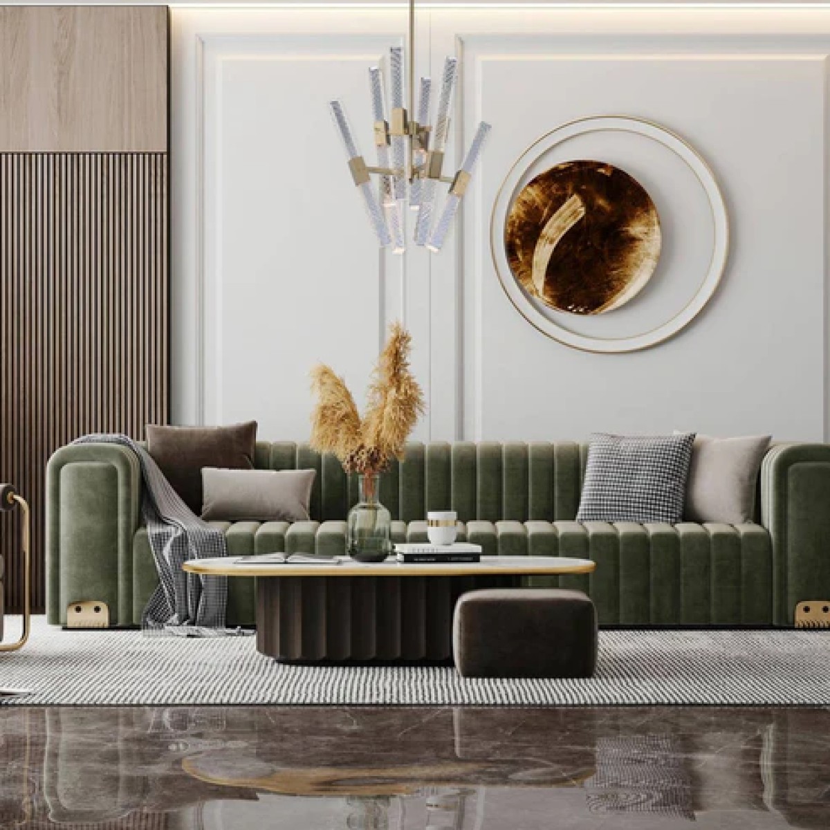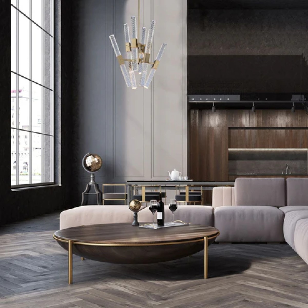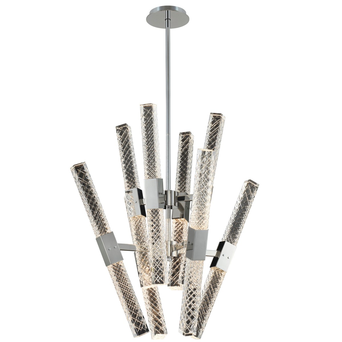 The Apollo Convergent Chandelier by Allegri from the Apollo Collection offers a sleek and contemporary design with driverless LED technology with hand-cut cool clear rectangular crystal rods, warm Brushed Champagne Gold finish.