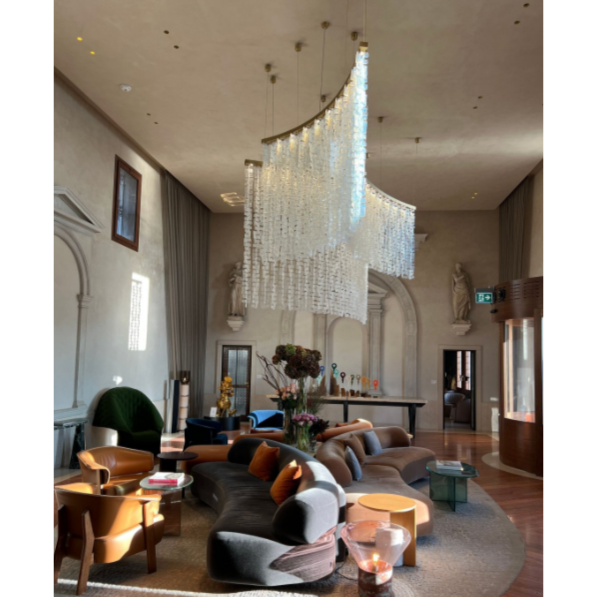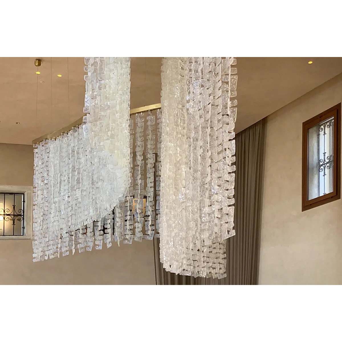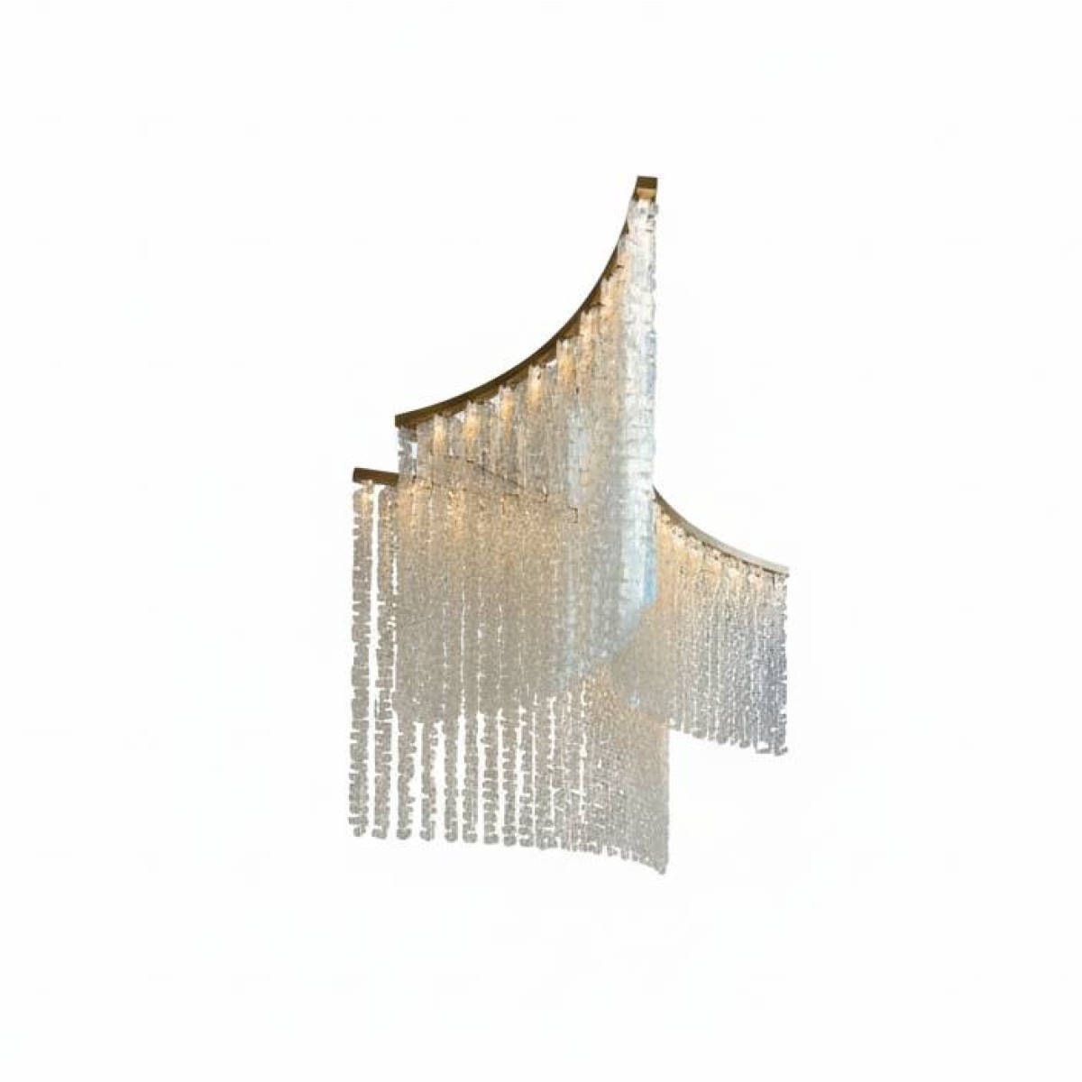 This custom crystal chain link is an exquisite modern masterpiece that cascades gracefully in a wave-like formation, creating a breathtaking focal point. Its design features multiple tiers of crystal prisms that shimmer beautifully as they catch and refract light. The gentle curve of the structure gives it a sense of motion, resembling a flowing waterfall of light. Suspended from fine cables, the fixture combines architectural precision with luxurious opulence. Perfect for grand living areas or hotel lobbies, it evokes elegance, sophistication, and contemporary artistry in one stunning statement piece.
