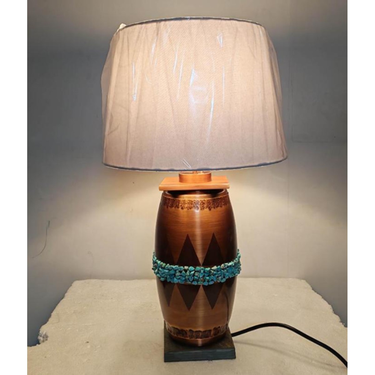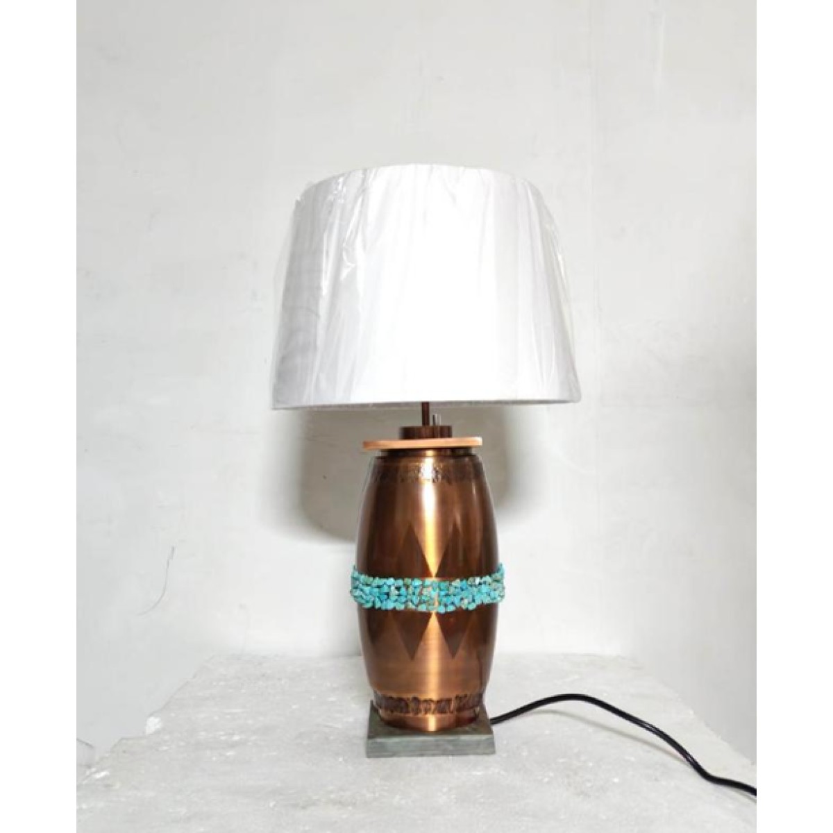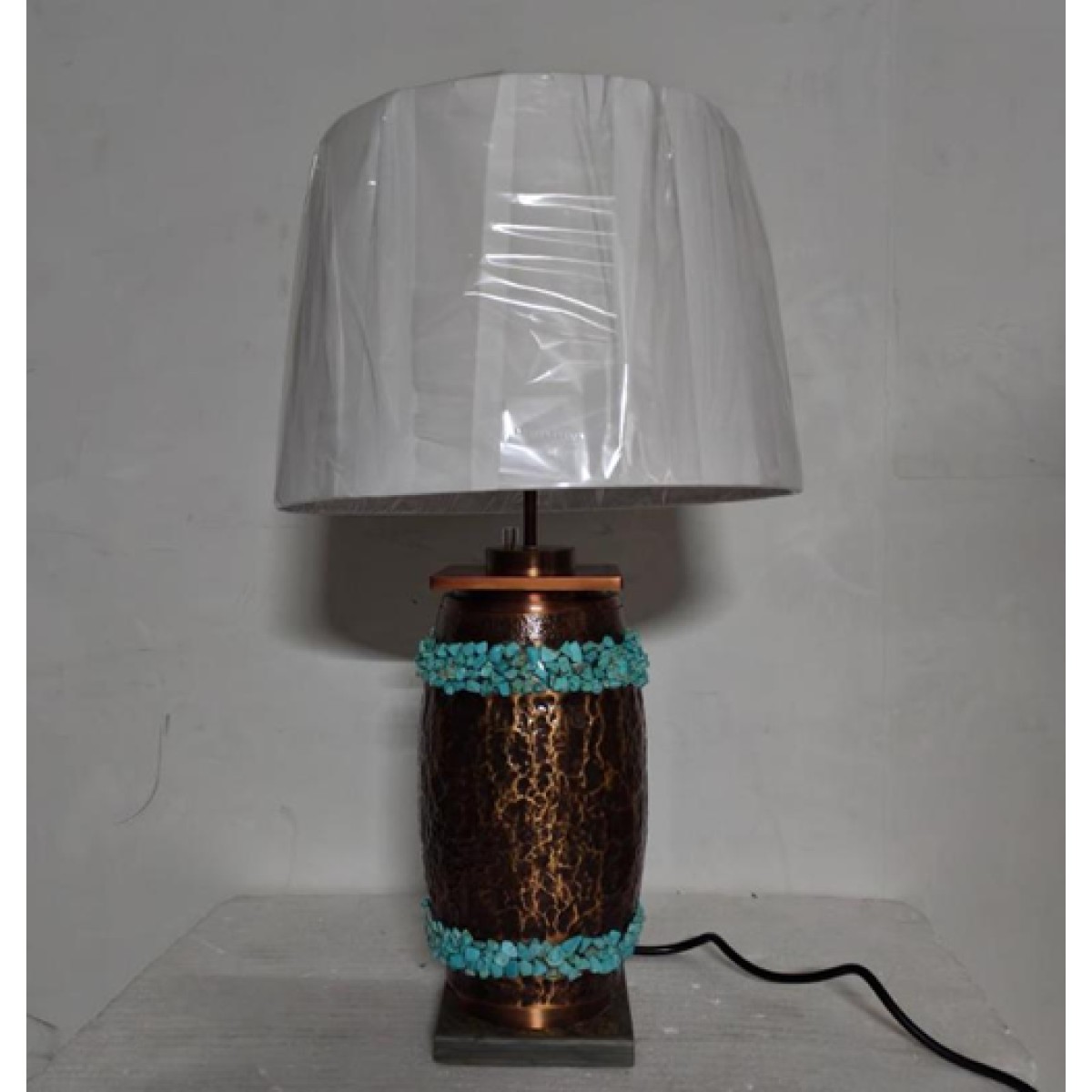 The Manire table lamps feature a sturdy, vase-shaped base with a warm metallic appearance that gives it a premium, handcrafted look. The base is accented with a decorative horizontal band of small turquoise stones, adding a pop of color and artistic detail. It stands on a square base, providing stability and a clean, contemporary foundation. The overall design blends traditional craftsmanship with a modern decorative touch, making it suitable for living rooms, bedrooms, or side tables. The lamp has a balanced and elegant presence that works well as both a functional light source and a décor piece.