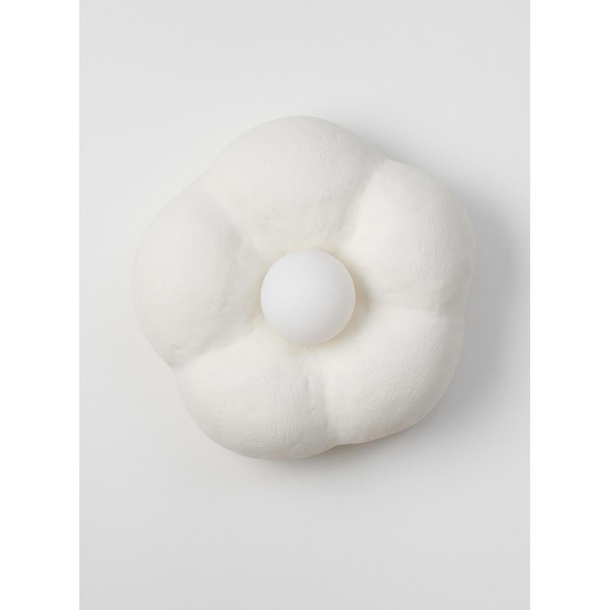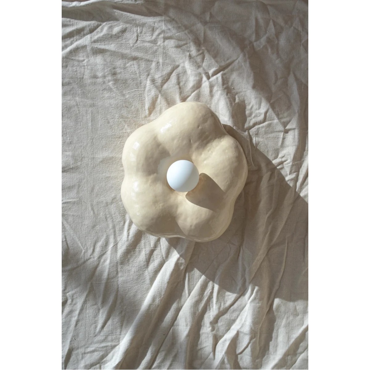 The Puffy Daisy Sconce is a handmade, made-to-order ceramic wall light designed by Eny Lee Parker, featuring a soft, organic silhouette with a frosted acrylic base and brushed brass accents paired with a Tala light bulb for warm illumination. This sculptural sconce carries a playful yet refined aesthetic typical of Parker’s work, where traditional craft meets contemporary design, and it’s UL-listed for safe use in interiors.