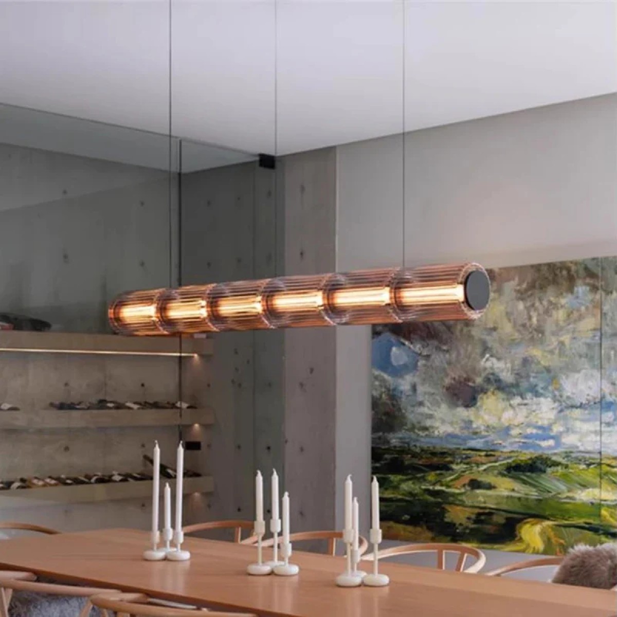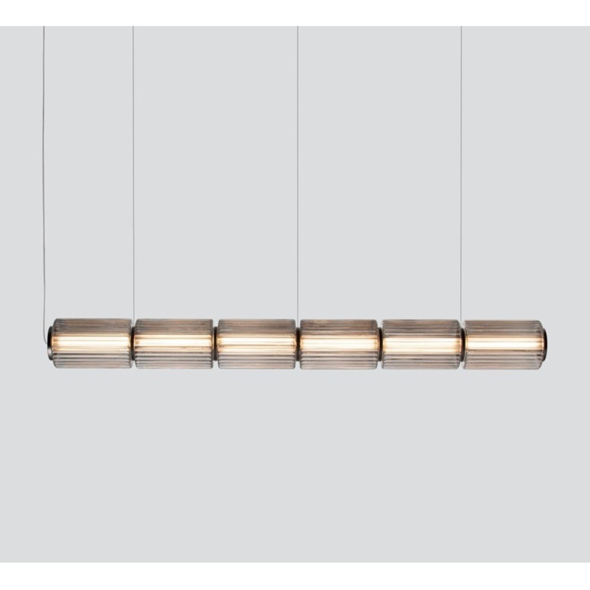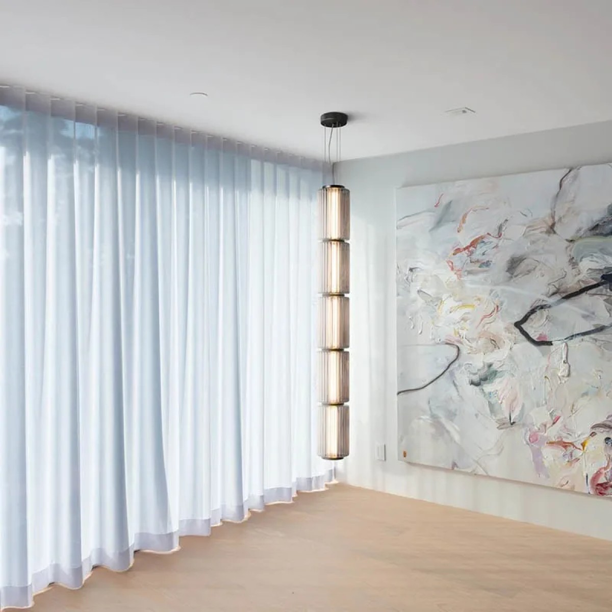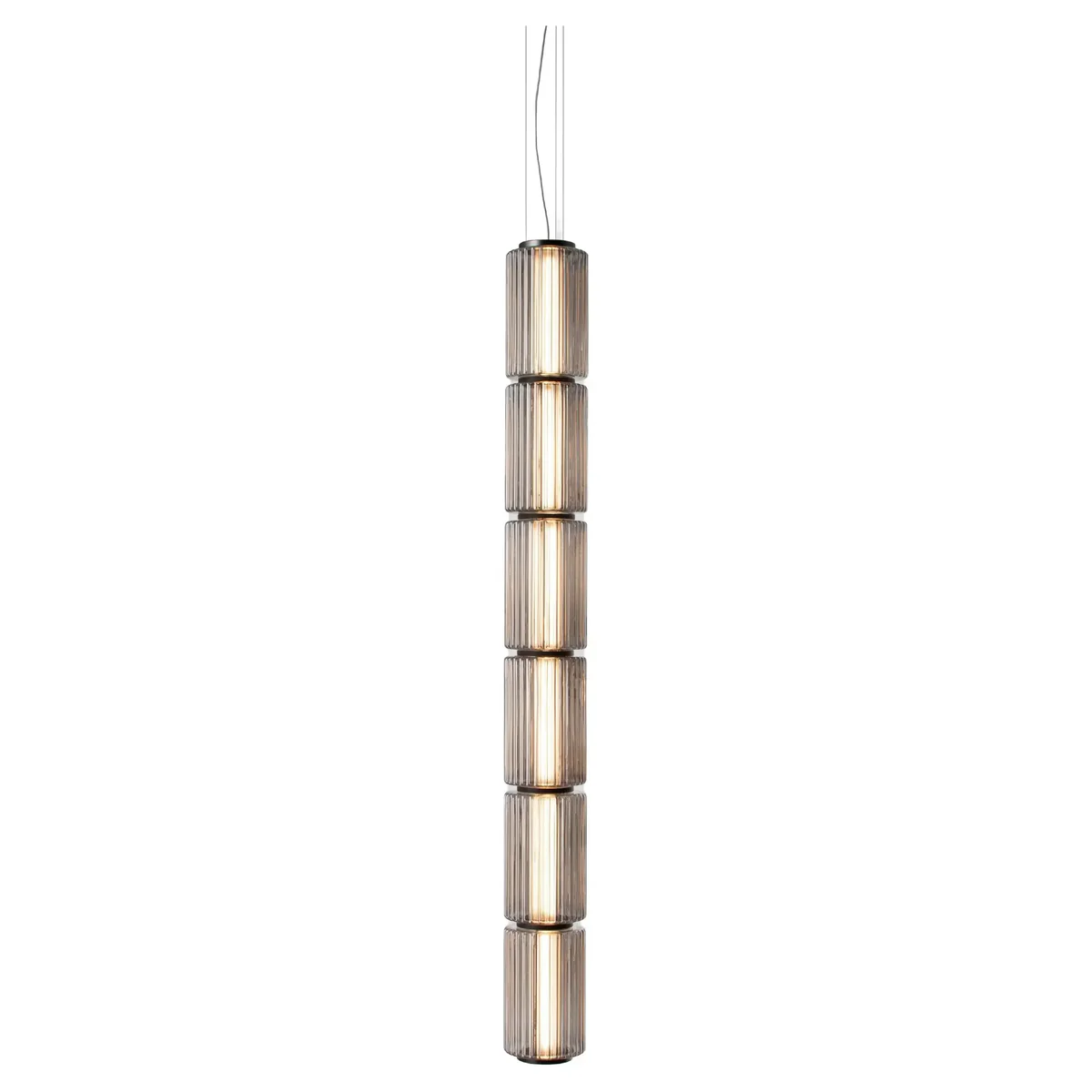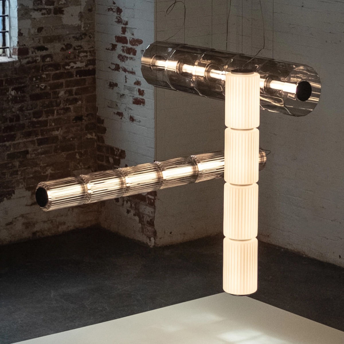 The Column pendant conveys order, symmetry and magnificence, much like the Grecian doric columns found in classical architecture. The faceted surface of the fixture alludes to the fluting of columns on buildings and temples to create a sense of rhythm, which softly diffuses the light as it radiates into the space. As it can be arranged in segments of machine mould-blown glass cylinders, it can lengthen a space vertically or expand it horizontally.