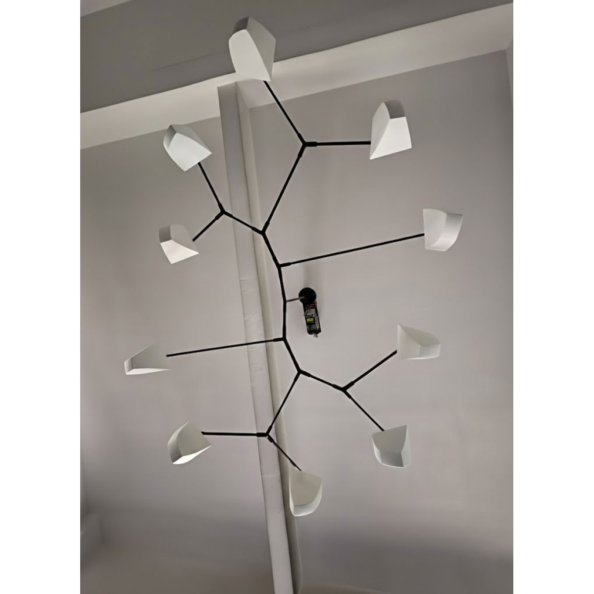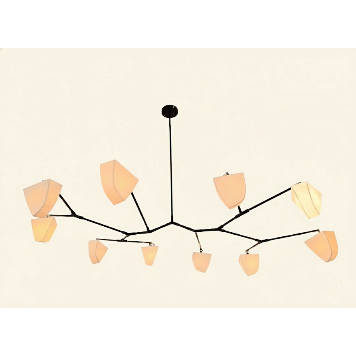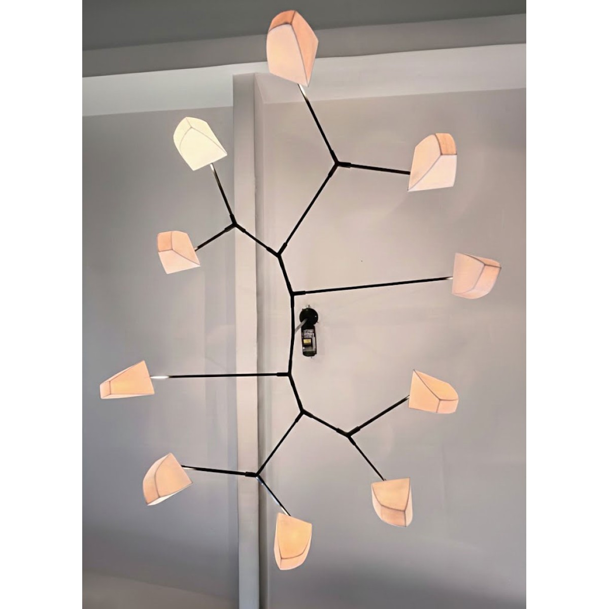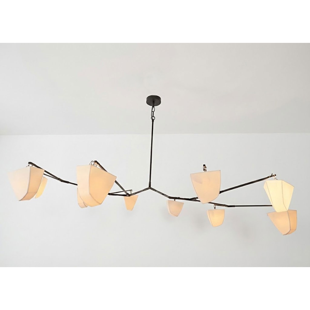 Cassiopeia Chandelier is a large horizontal mobile chandelier with thirteen handmade translucent porcelain polyhedrons and three hanging points. This special version of the Cassiopeia Series was designed to float horizontally extending in two directions, and it demonstrates the flexibility of our proprietary hanging system. The intention was to create a modern chandelier that would defy expectations by also being a unique, abstract floating sculpture. When turned off, the polyhedrons appear solid, but when turned on they transform into glowing light bodies. The Cassiopeia Series is designed for spaces with lower ceiling heights, where a horizontal chandelier is ideal. Cassiopeia 6 offers numerous variations and can be customized in size and finish. The proprietary frame system utilizes our unique brass tubing to conceal the wires and incorporates specially designed joints to create its distinctive shape. The subtle, almost imperceptible movement of the fixture adds a pleasant animation to the object.