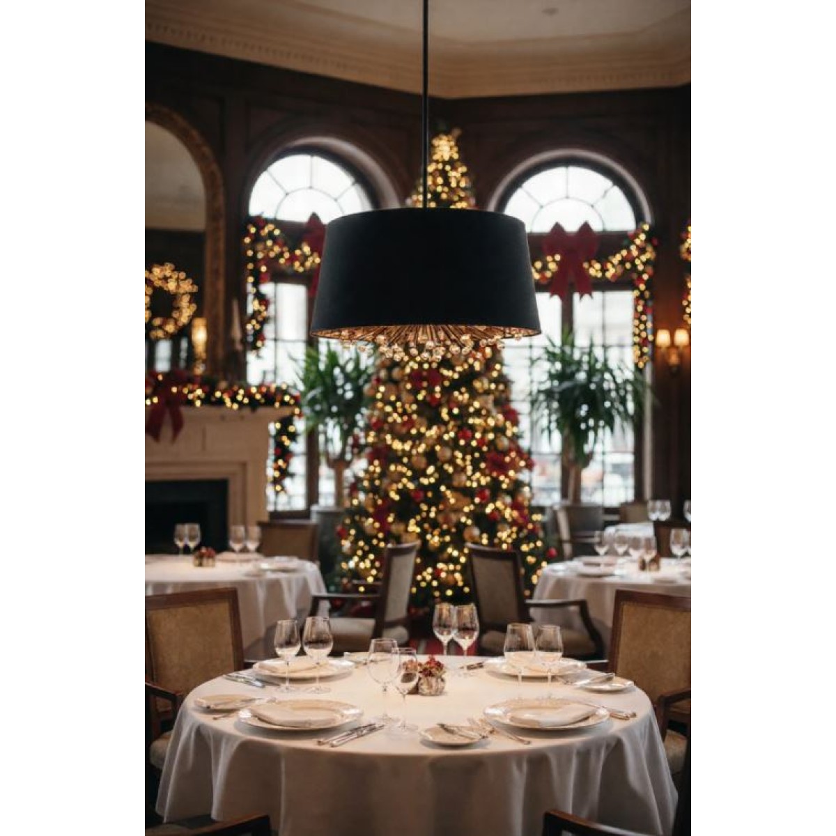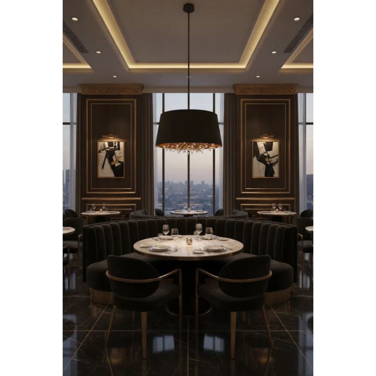 The Isla Black Shade Pendant is a bold yet refined lighting statement, designed to anchor a space with depth and sophistication. Its chic black silk drum shade is contrasted by a luminous gold-foil interior, creating a warm, inviting glow. Beneath the shade, decorative glass spheres are delicately fastened to a sputnik-inspired core, adding texture and visual intrigue. Striking the perfect balance between drama and elegance, the black-and-gold palette lends richness and character while remaining timeless. Contemporary in spirit yet versatile in application, the Isla pendant sharpens any décor scheme and brings a confident, architectural presence to both residential and hospitality interiors.
