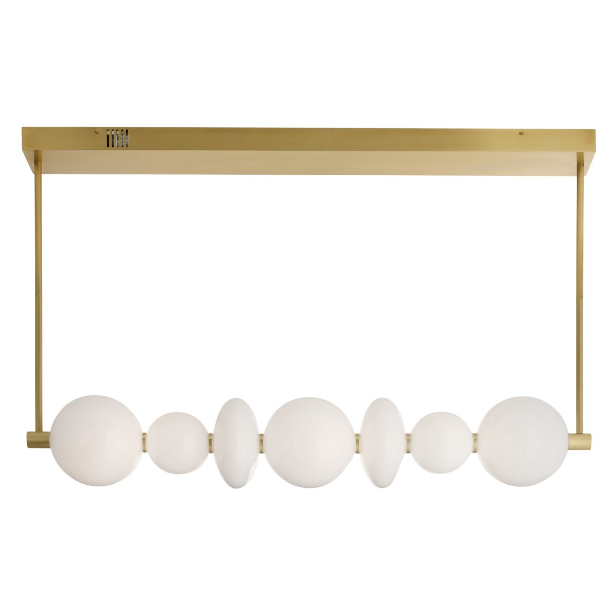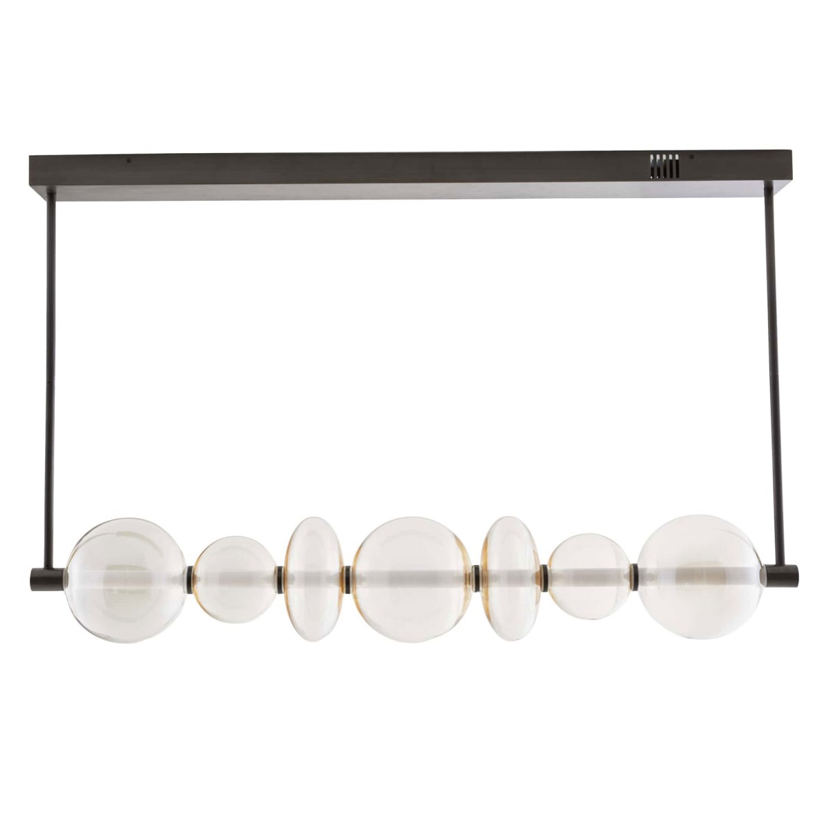 The RAPHAEL chandelier strikes a refined balance between organic and contemporary design. Totemic shades of champagne and smoke glass are strung like beads along a white acrylic diffuser and anchored to a linear framework constructed of English bronze iron.
