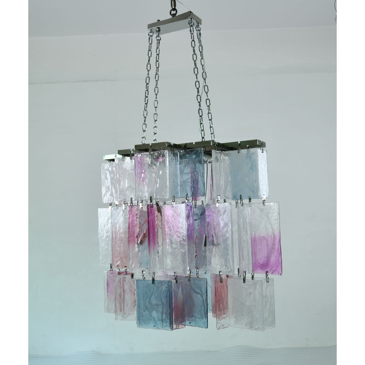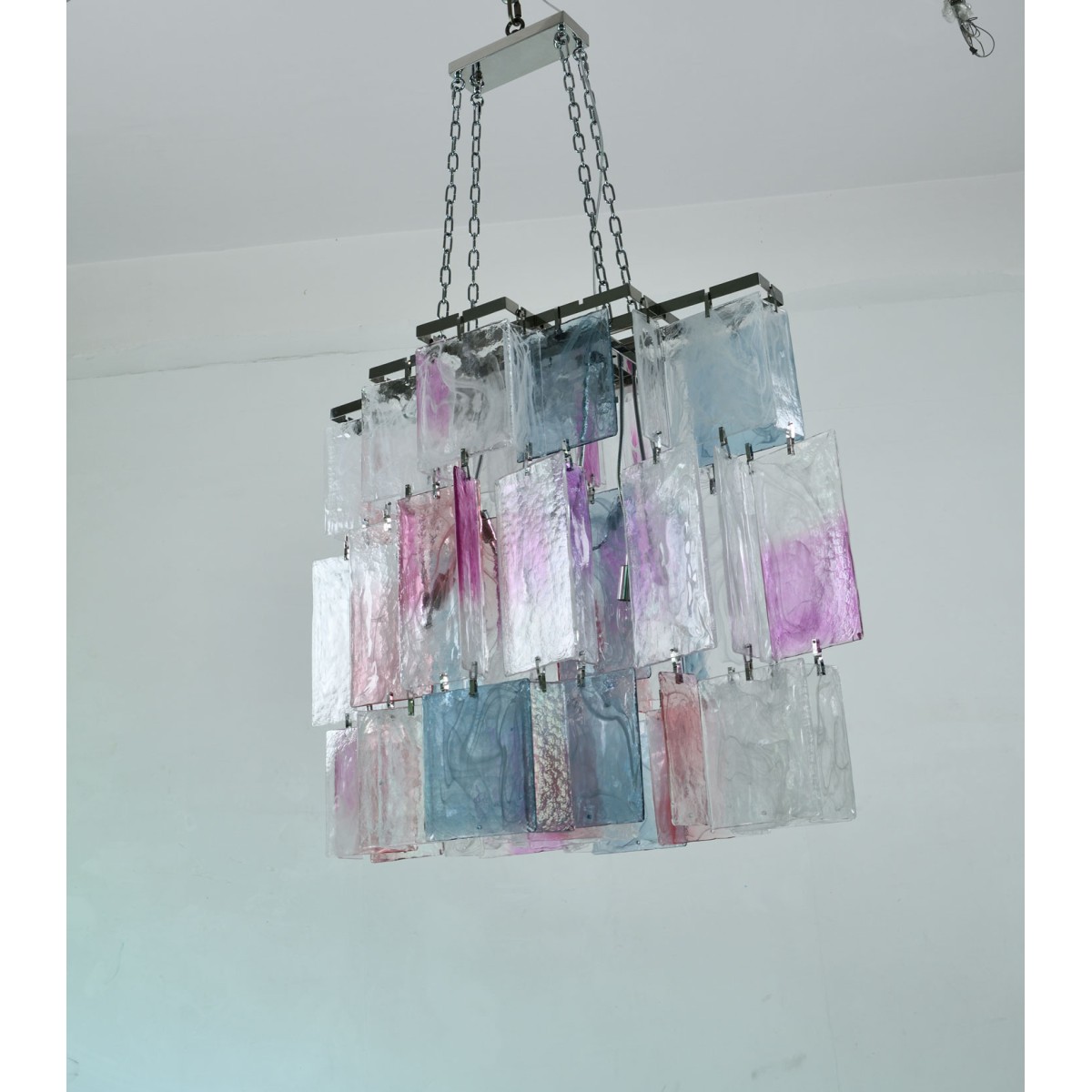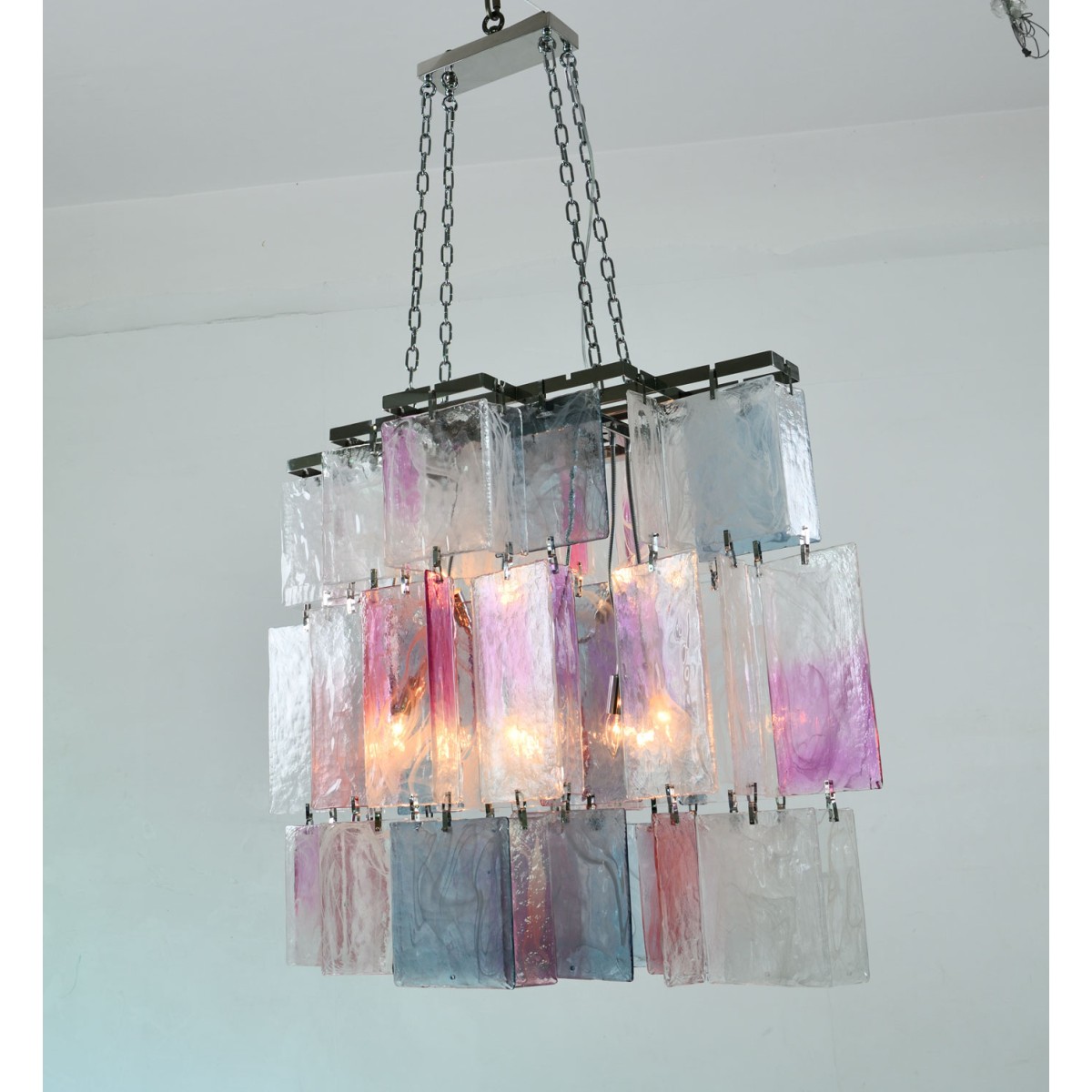 Originally commissioned in the 1980s for a Parisian restaurant, the Amethyst Chandelier is a striking example of timeless elegance and artisanal mastery. Hand-blown in Murano, Italy, this one-of-a-kind piece features three dramatic tiers of rectangular amethyst crystals, each meticulously crafted to radiate depth and sophistication. Designed to make a powerful statement, the chandelier is ideally suited for grand dining spaces or rooms that demand a centerpiece of exceptional presence. The rediscovery of Murano glass as a conduit of magical light has inspired a new era of design—where tradition meets innovation and every piece becomes a work of art. The precious and organic nature of Murano glass infuses this chandelier with an aura of mystery and uniqueness. Its rich color, transparency, and luminosity create a seductive play of light, transforming any setting into a glowing showcase of refined luxury.