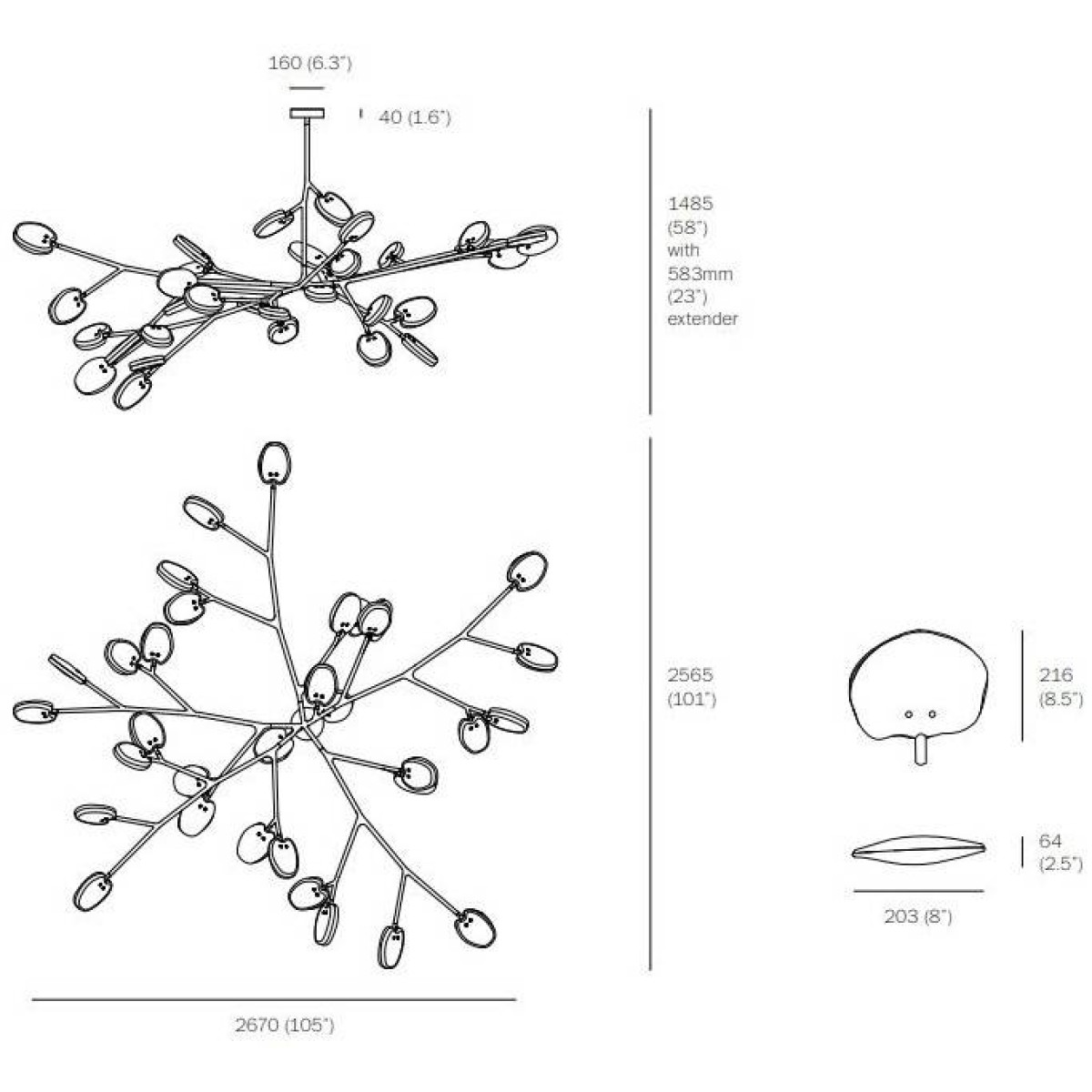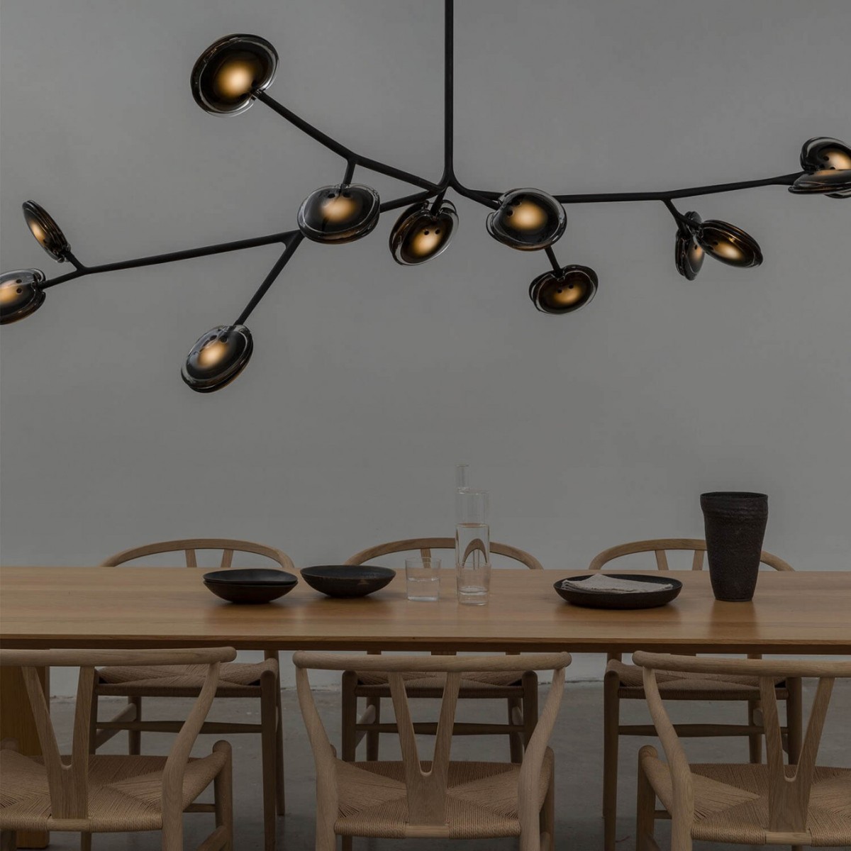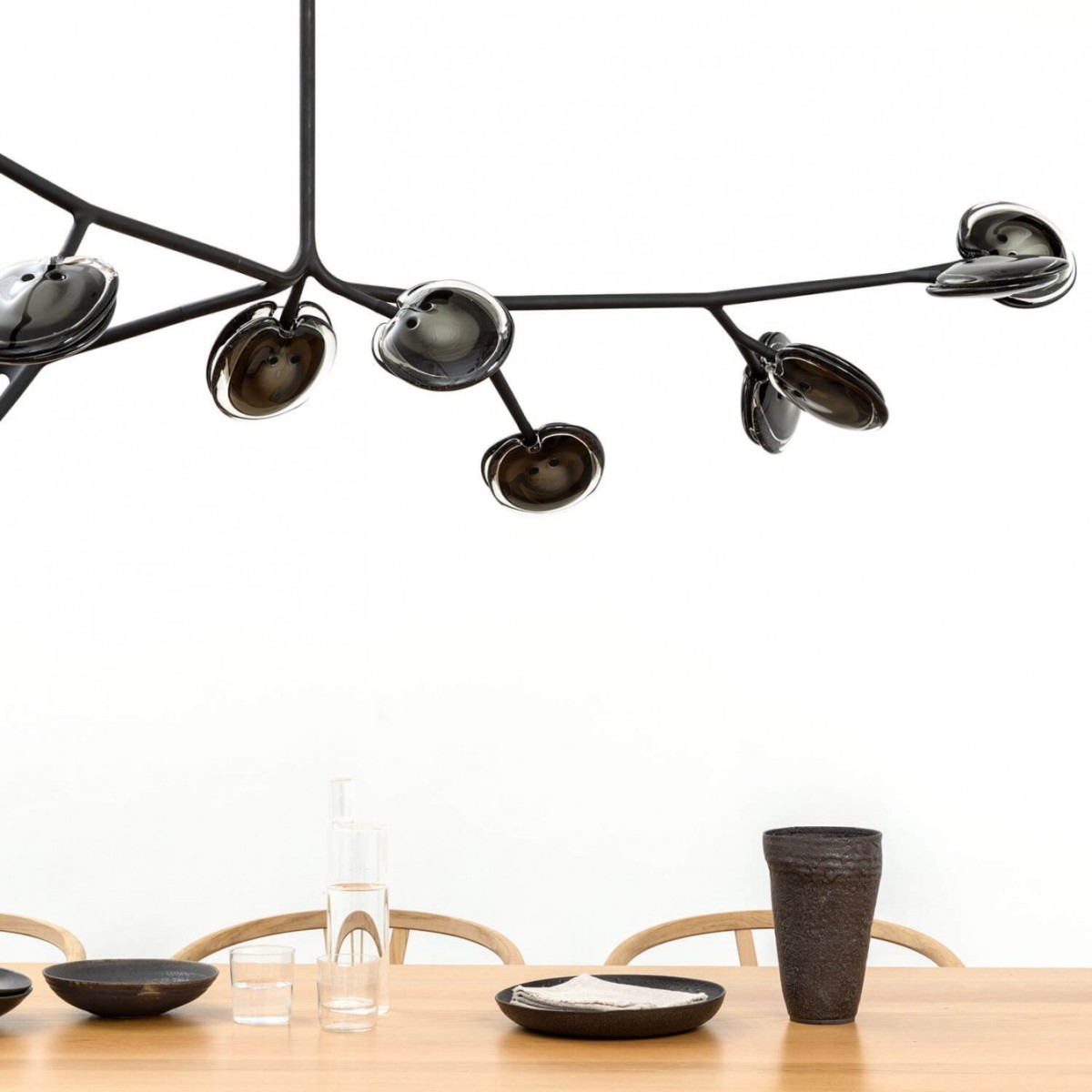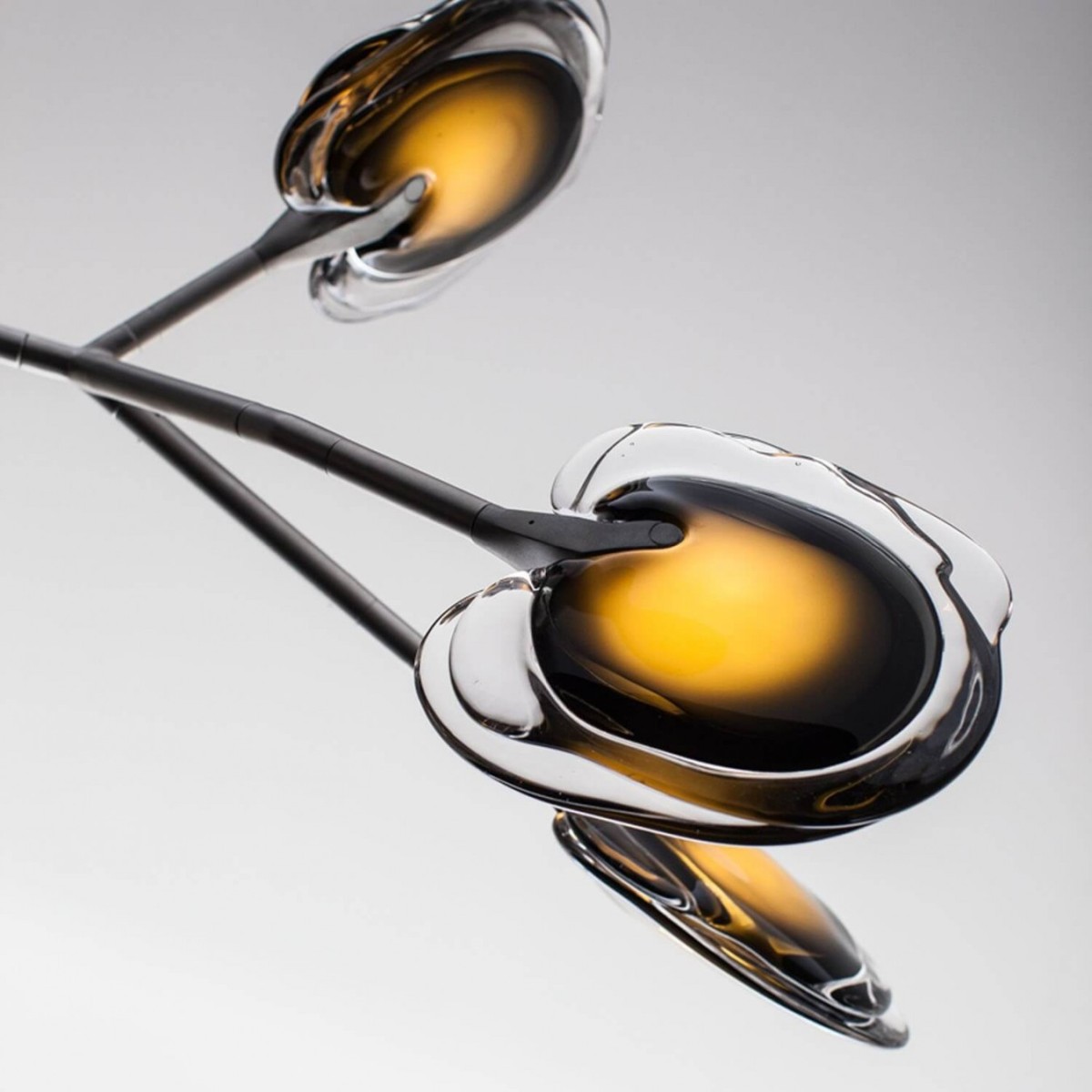 WM2090 GREY FLANNEL ARMATURE is formed by sequentially pouring three separate layers of molten glass – in varying opacities – on a horizontal plane. Each layer responds to the indeterminate shape of the previous pour to create a uniquely layered whole. Two of these pieces are then attached and illuminated with an internal LED lamp. 16 series is available in 4 colors.A bespoke chandelier which can be made in various sizes and in a massive range of glass color combinations. A steel armature system in a soft-touch matte black finish allows precomposed branches to be easily connected to a series of hubs during installation.