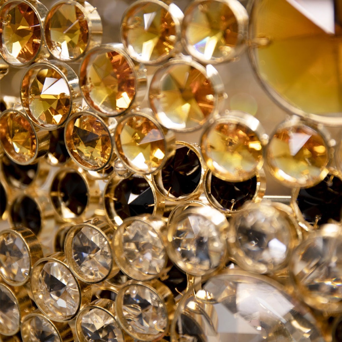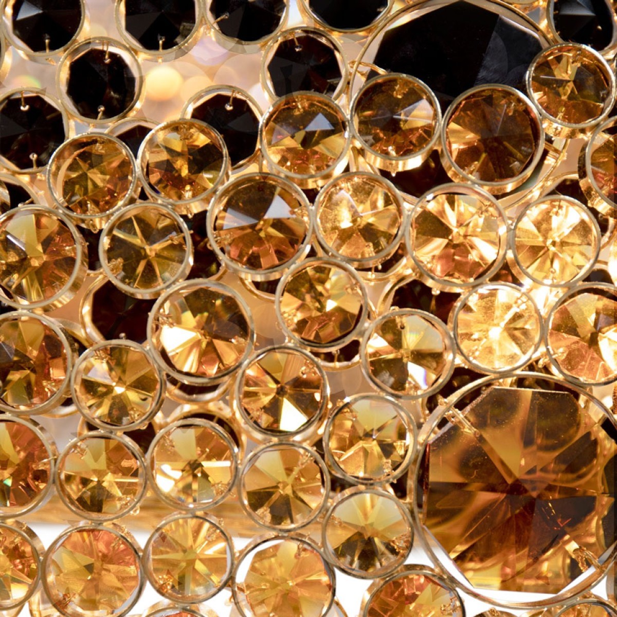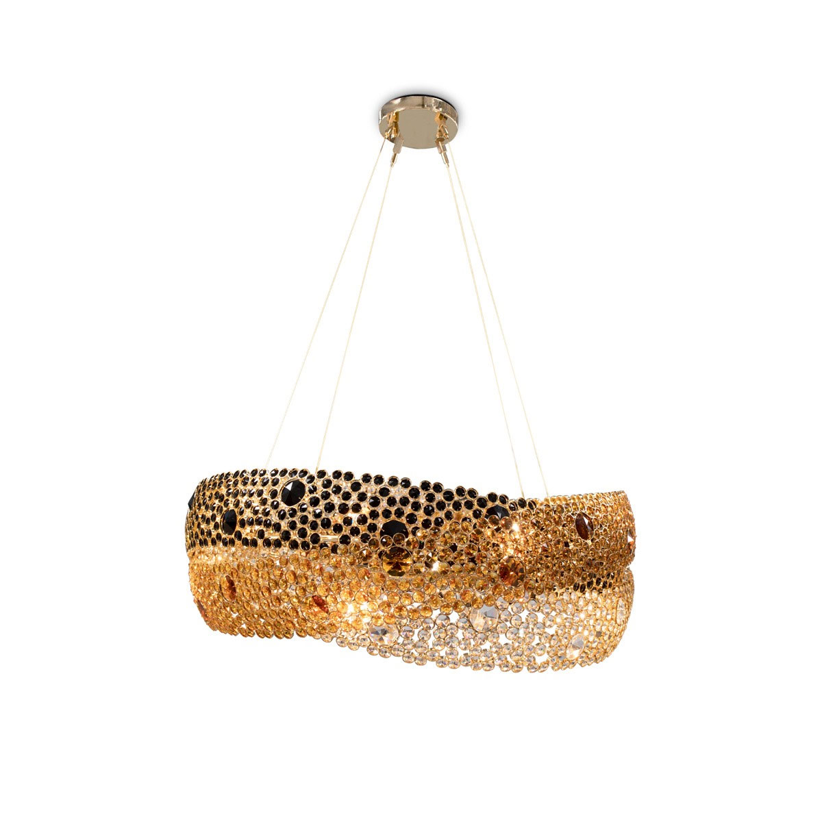 Symbolic of love, fidelity and friendship, three rings composed of clear, amber and black crystals each individually wrapped in brass circles intertwine in the Trinity Chandelier. Infuse everlasting love in your interior with this brilliant statement piece. Original one of a kind chandelier. No two alike, each chandelier created from this design is a one of a kind. This hanging light looks interesting from every angle, and creates enticing shadows. One of the most technical chandeliers created. We approach this sculptural object in a contemporary, unexpected and creative way. Light and shadow interplay while existing harmoniously, using both to manipulate space and thought.