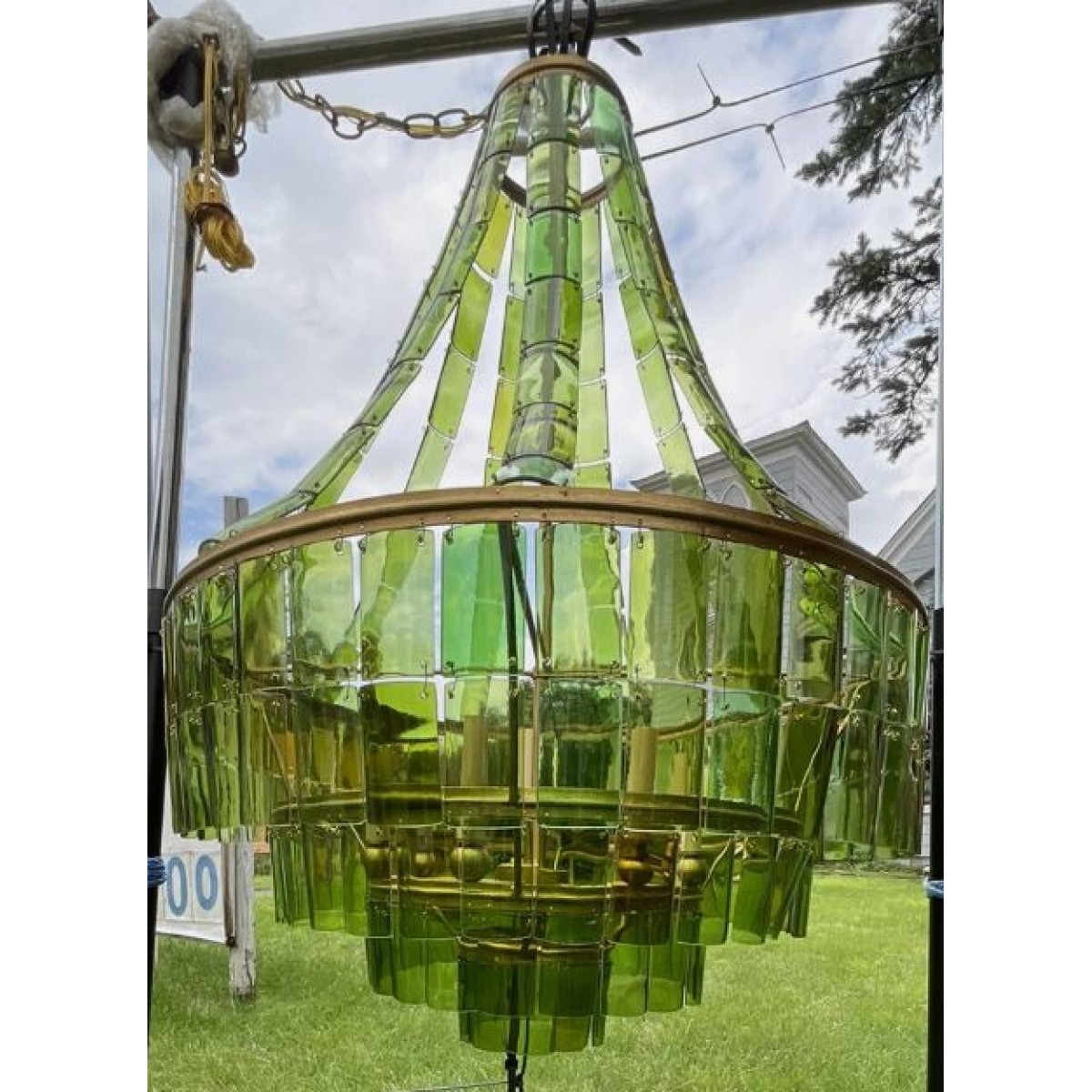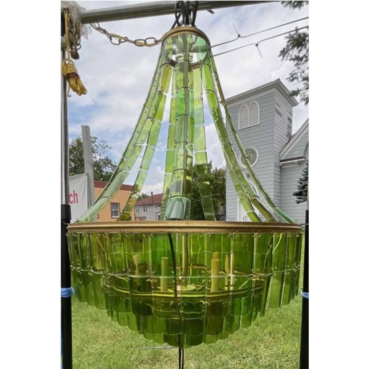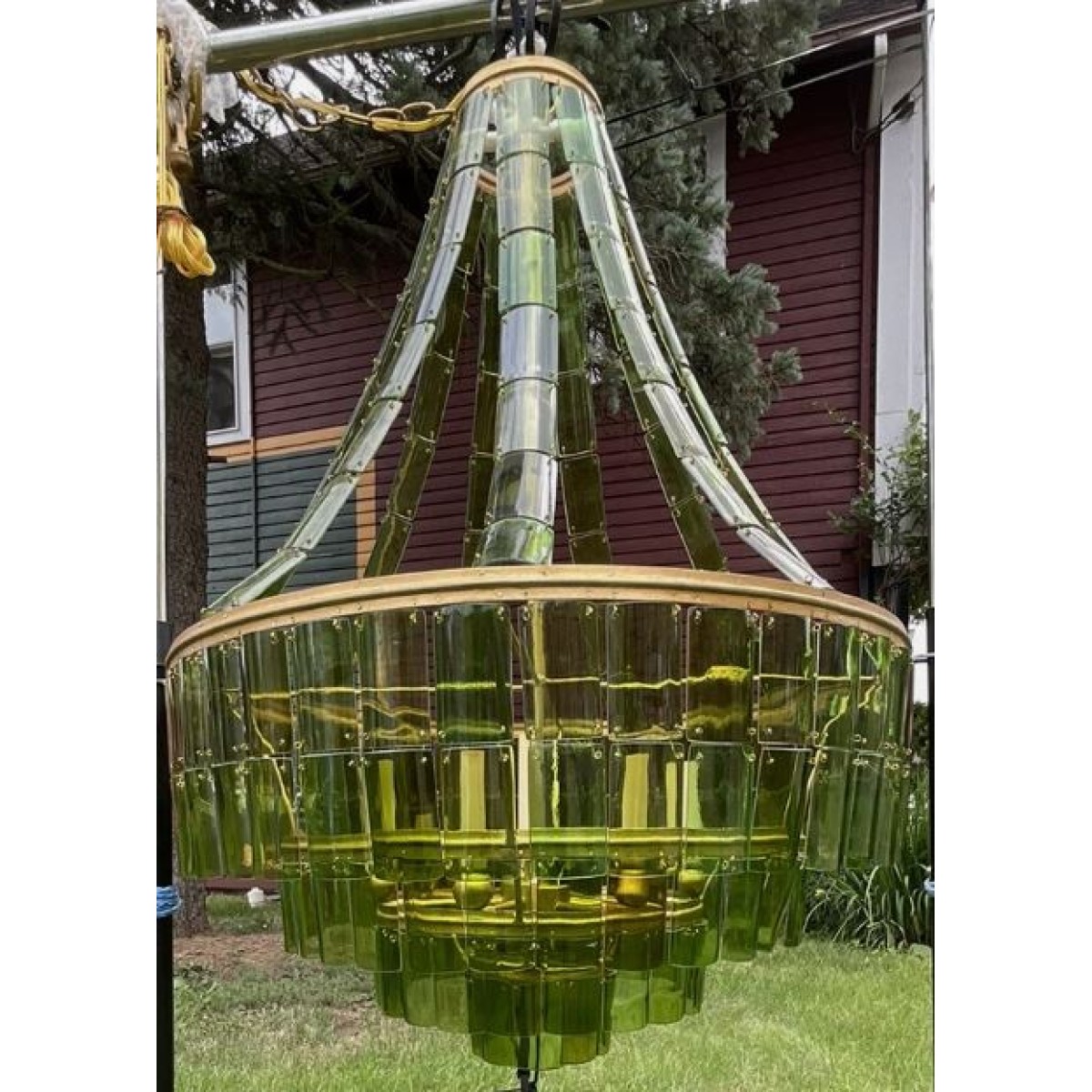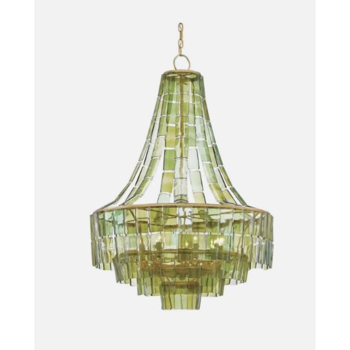 The classic silhouette of the VINTER Chandelier is where tradition ends and artistry begins. This striking fixture is composed of individually cut, hand-selected pieces of recycled wine bottles, cascading in layers of naturally varied green tones. The glass elements create a lively interplay of texture and transparency, suspended from an iron frame finished in radiant gold leaf. A true conversation piece, this eco-conscious chandelier brings both sustainability and style to any interior. Perfect for foyers, great rooms, or living spaces, the VINTER Chandelier adds a fresh, organic elegance to both modern and rustic environments.