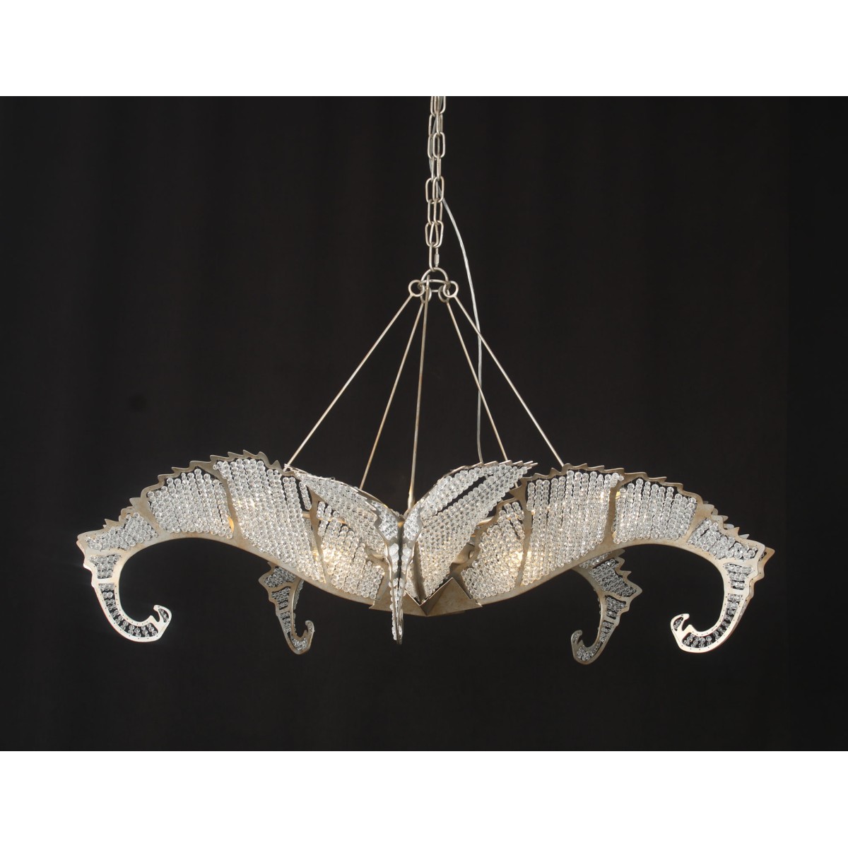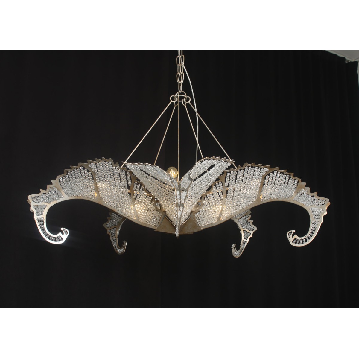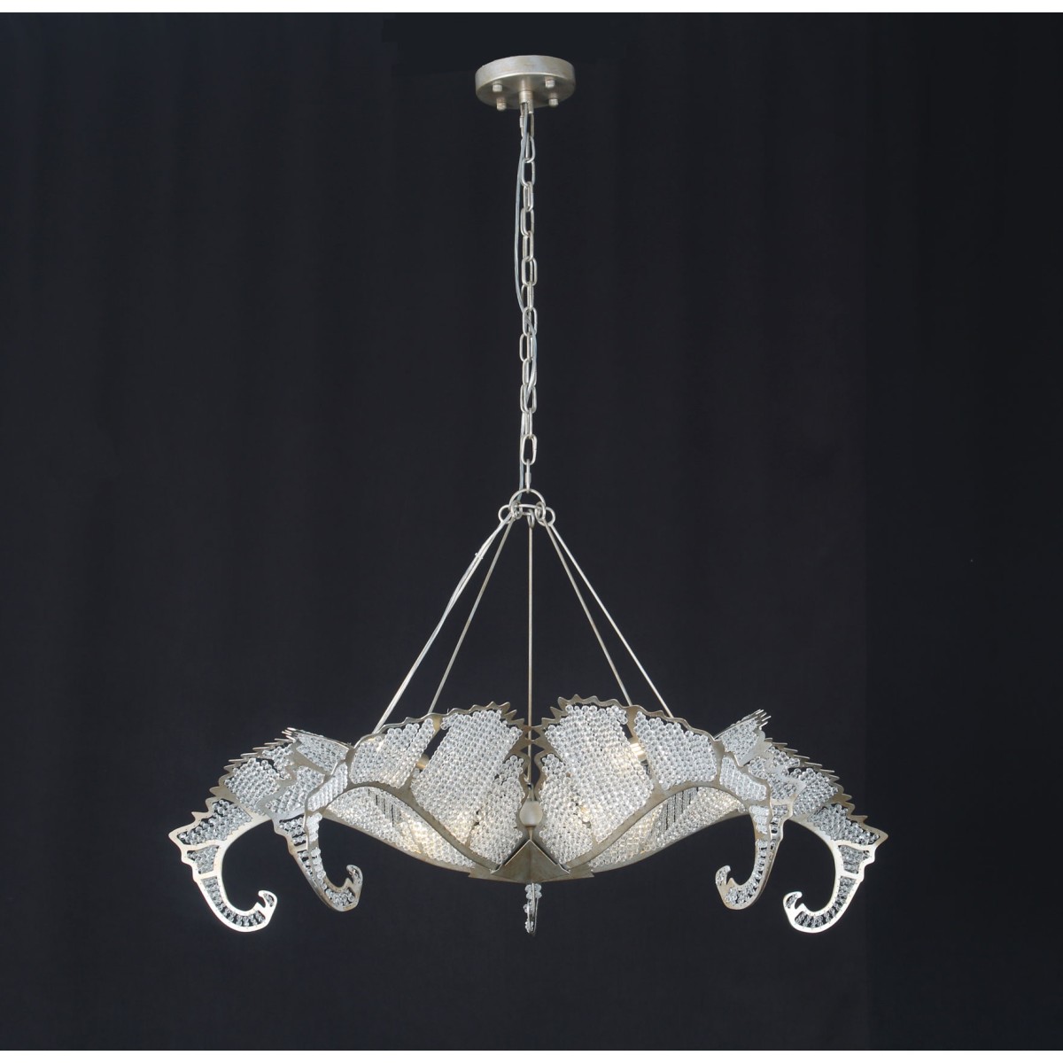 The Biarritz Pendant Fixture design was inspired by nature. From below, the fixture resembles a crystallized snowflake. Viewed from the side, it recalls a cluster of stylized leaves outlined in our Venetian silver leaf finish. Many strands of crystal, resembling the soft veins in a leaf, complete this simple yet stylish design.