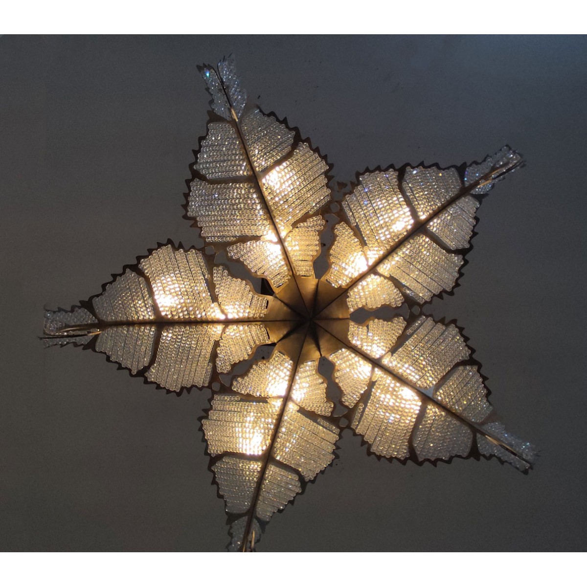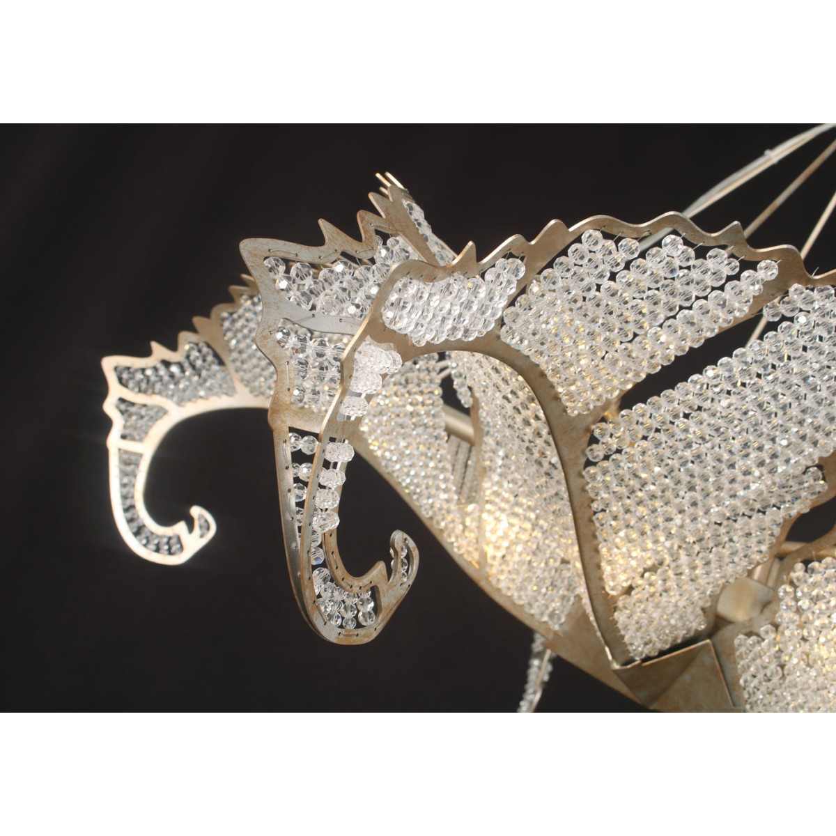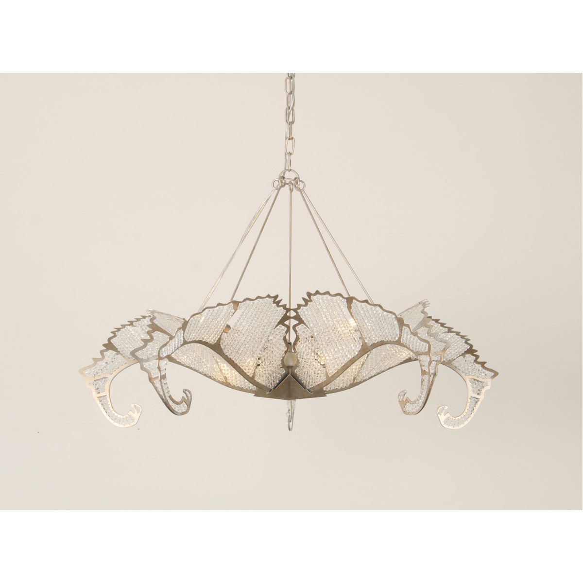 The Biarritz Pendant Fixture design was inspired by nature. From below, the fixture resembles a crystallized snowflake. Viewed from the side, it recalls a cluster of stylized leaves outlined in our Venetian silver leaf finish. Many strands of crystal, resembling the soft veins in a leaf, complete this simple yet stylish design.